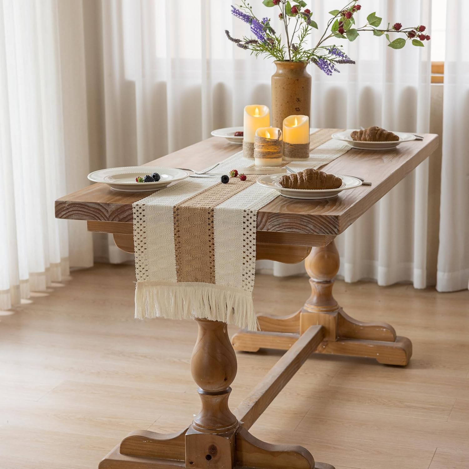 Boho Table Runner Cream Beige Brown for Home Decor 12x90 Inches Farmhouse Macrame Burlap Jute Rustic Dining Kitchen Centerpiece Bohemian Decor French Country Bridal Shower Decorations