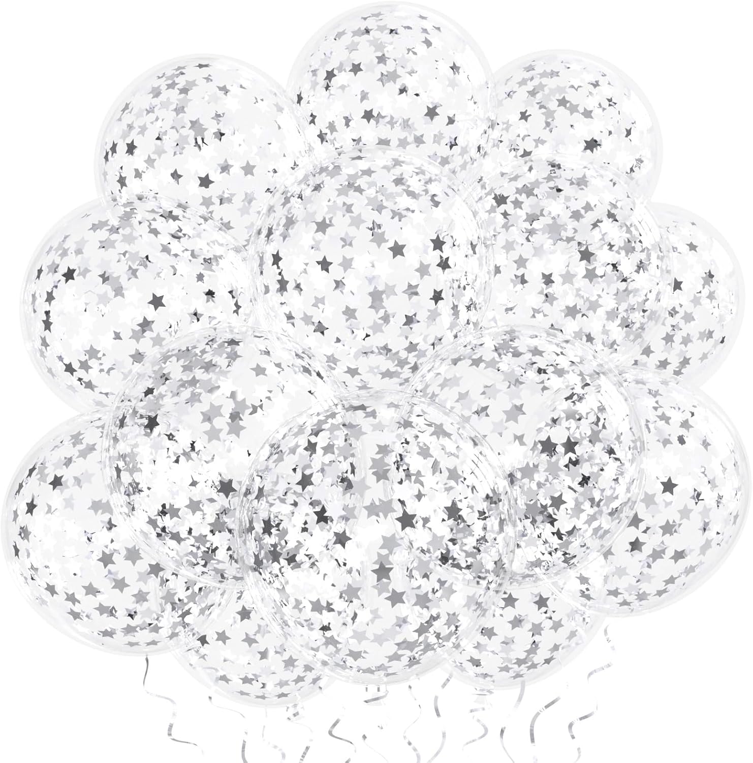 VHUWE 25 Pcs Silver Star Confetti Balloons, 12 Inch Clear Latex Balloon with Confetti Inside for Birthday Party Baby Shower Graduation Engagement Bridal Shower Decorations Supplies - Star Confetti