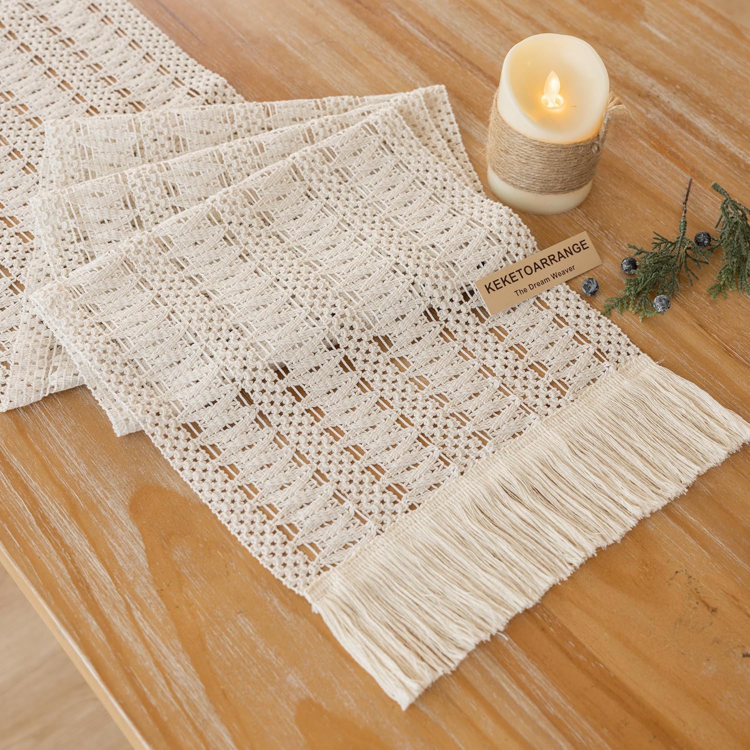 Keketo Boho Table Runner White for Home Décor 12x72 Inches Farmhouse Macrame Burlap Jute Rustic Dining Kitchen Centerpiece Bohemian Decor French Country Bridal Shower Decorations
