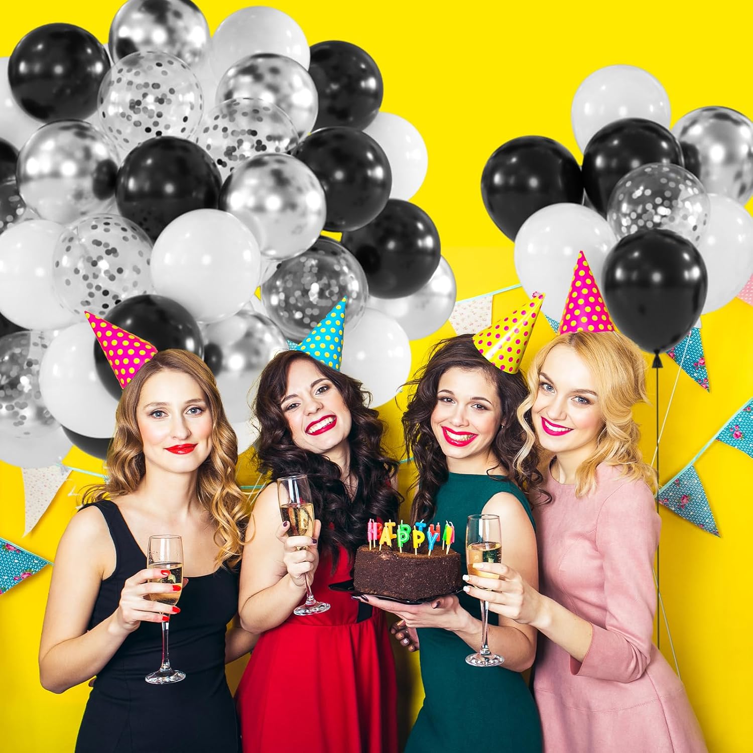 - Chrome Silver Elegance: 100 premium 12" balloons ( 40 black balloons, 40 white balloons, 10 metallic silver balloons, 10 silver confetti balloons ) + 2 ribbons. Vacuum-sealed for color brilliance - opens vibrant every time!