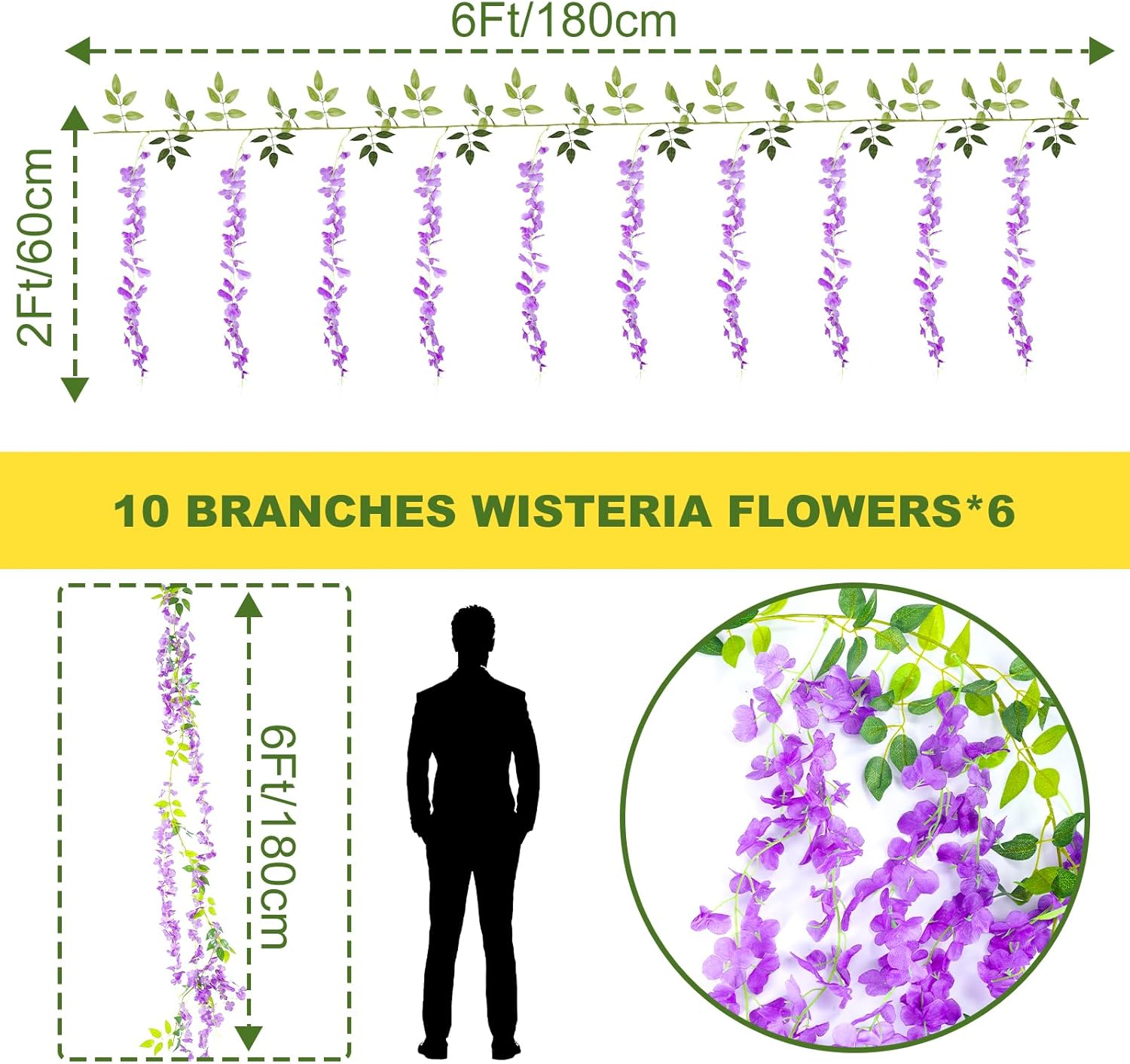 - Material:The artificial wisteria flowers are made of silk and have a silk-like touch. And these hanging flowers have plastic stems and metal wires, can be bent at will, you can bend according to your own needs to get the decoration you want.