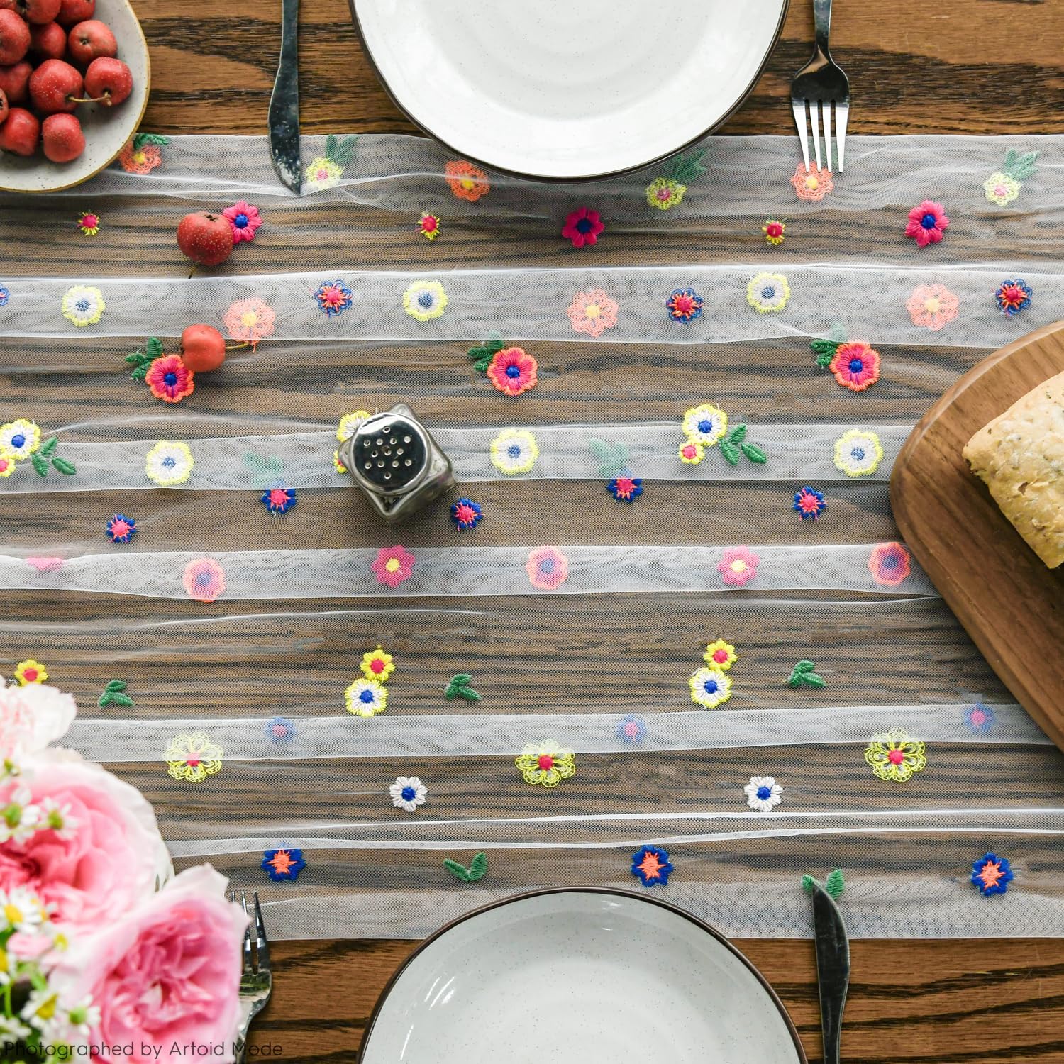 Artoid Mode Embroidery Daisy Gauze Table Runner 120 Inch 10FT, Seasonal Sheer Kitchen Dining Holiday Wedding Birthday Table Decor for Home Party