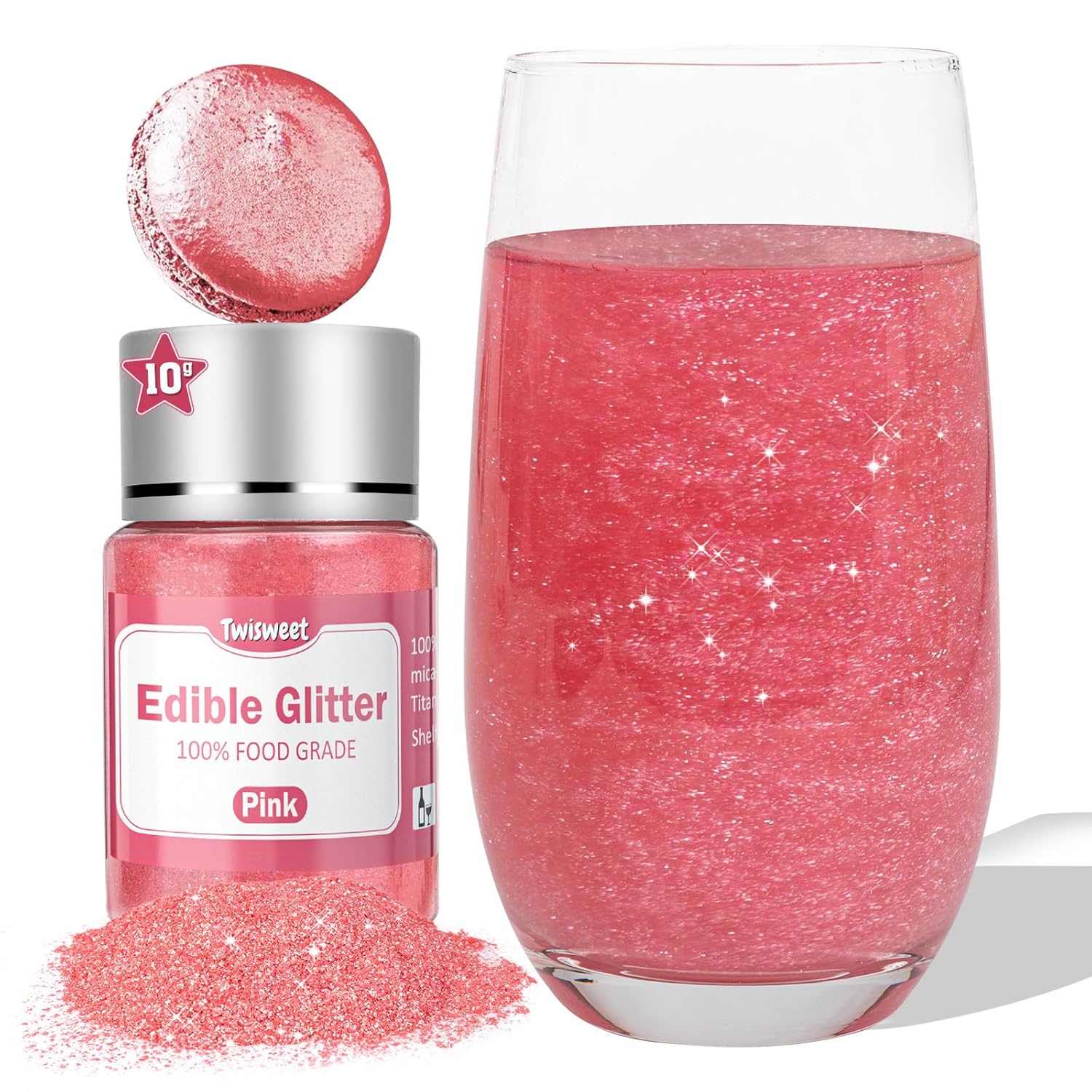 Twisweet Pink Edible Glitter for Drinks, Food Grade 10g Sparkling Sprinkles Cake Decorating Supplies, Edible Luster Dust for Cocktail Beverages, Food Coloring Shimmer Powder for Cupcakes Cookies Cake Decorations