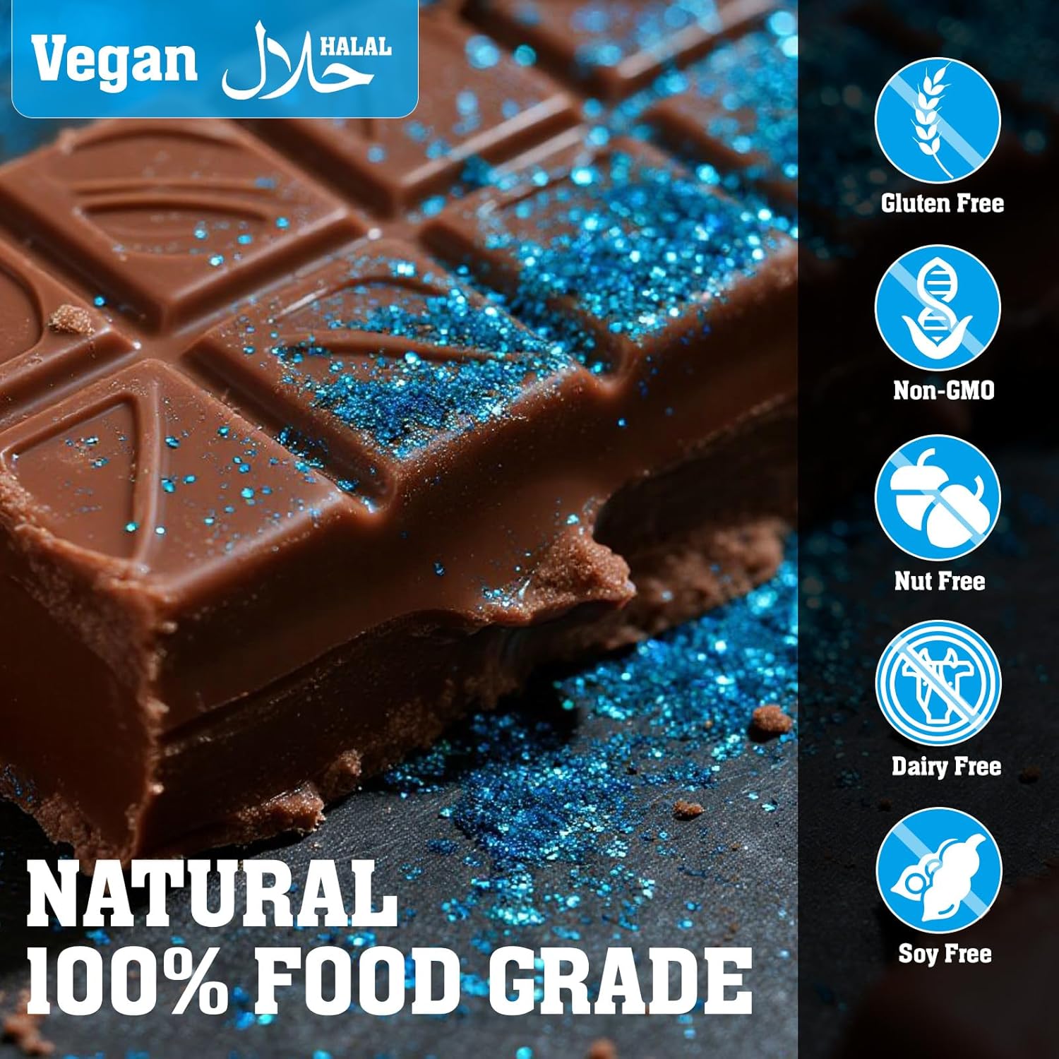 - 【Easy to Use & Versatile】: The edible glitter can simply apply dry with a brush, or mix with alcohol, lemon extract or oil-based flavorings for spray or brush application, or even mix into beverages. These edible luster dust is perfect for decorating frosting, fondant, whipped cream, cocktails, mocktails, champagne, and chocolates with a stunning Blue shimmer effect.