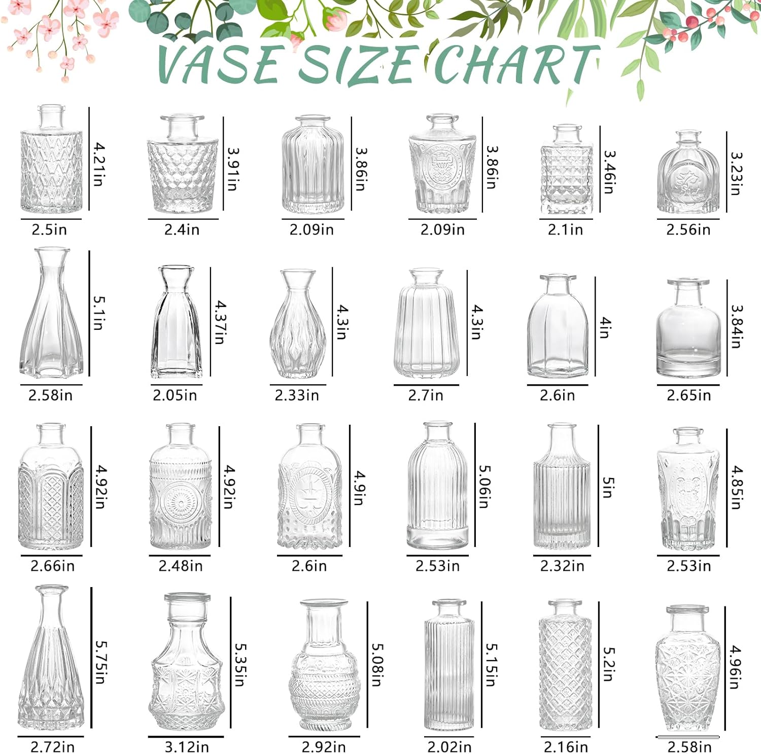 - ELEGANT VINTAGE STYLE: This set includes 24 glass bud vases, each adorned with delicate etched patterns for added charm. These flower vases boast a classy vintage design, suitable for any occasion, from casual to formal. Spruce up your window sill, dining table, or wedding reception with these beautiful vintage décor vases, creating an elegant centerpiece that will captivate all who see them.