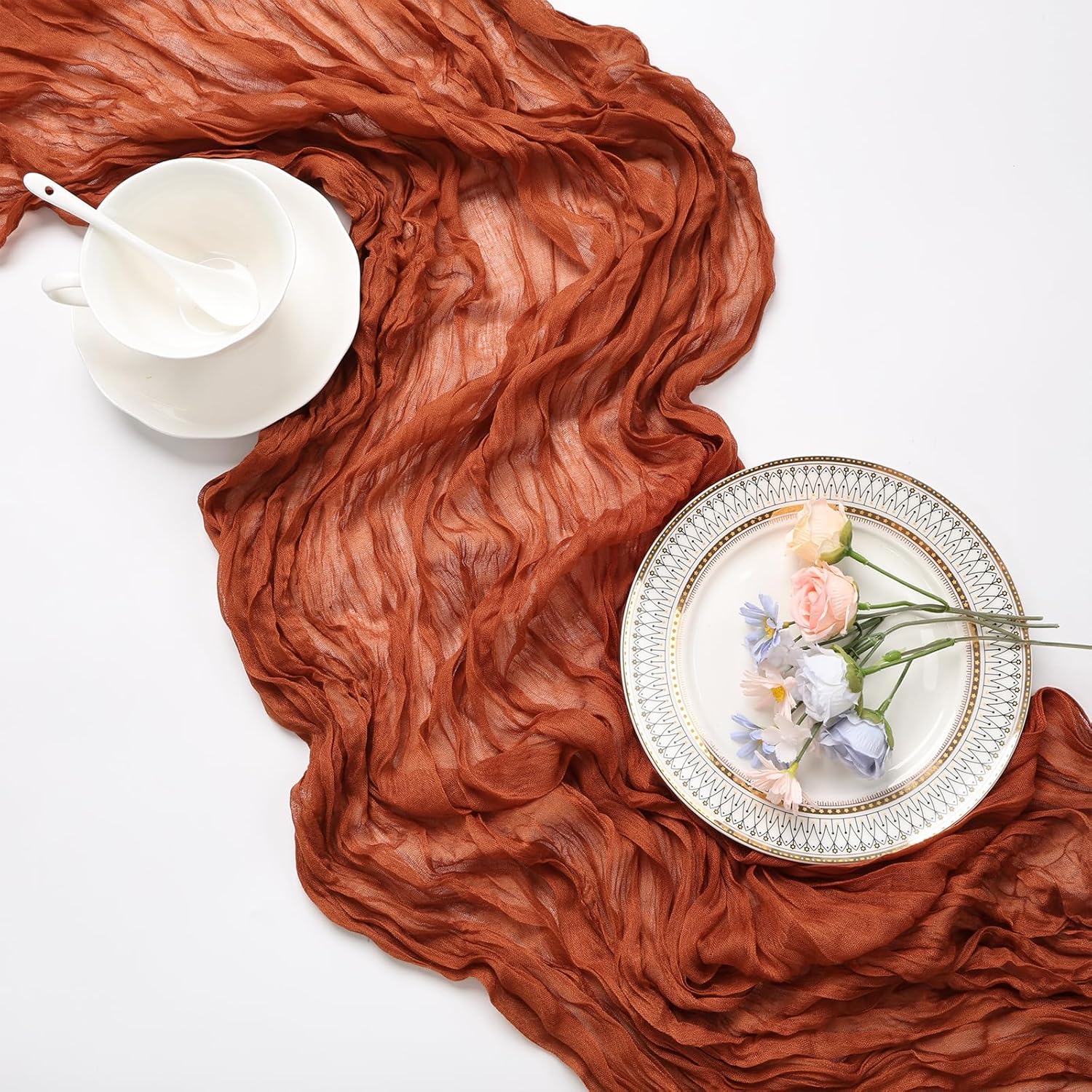 - 【Care Instructions】For The Vintage Terracotta Cheese Cloth Table Runner, It Is Recommended That You Put Them In A Laundry Bag For Machine Washing Or Hand Wash With Cold Water. To Preserve The Wrinkled Texture Of The Gauze Table Runners, Please Do Not Iron Or Bleach Table Runners. Also, Avoid Direct Exposure To The Sun To Prevent Fading, So That They Can Be Used For A Long Time.