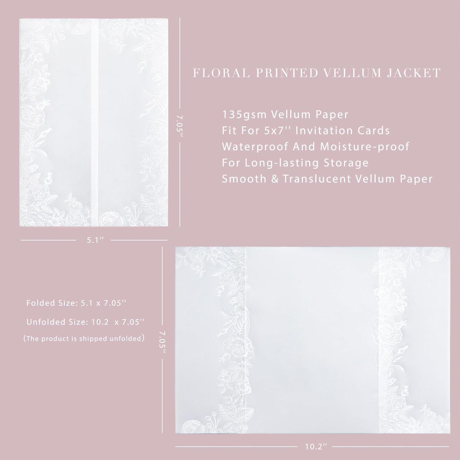 - 【Size】: These Pre-printed Vellum jackets measure 5.1 x 7.05'' after folded which are designed to fit a 5 x 7" wedding invitation and corresponding insert cards