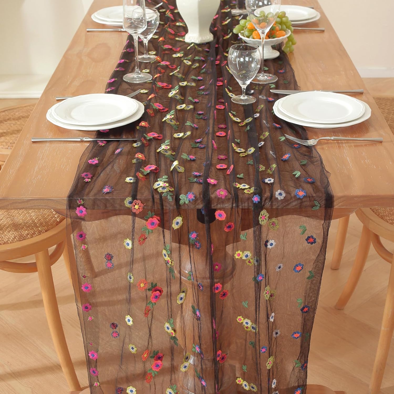 Black Embroidery Daisy Fall Table Runner 120Inch 10FT Florals Soft Sheer Tulle Fabric Table Runner for Home Decor, Brithday, Wedding, Baby Shower ,Holiday ,Parties, DIY Craft,1PC