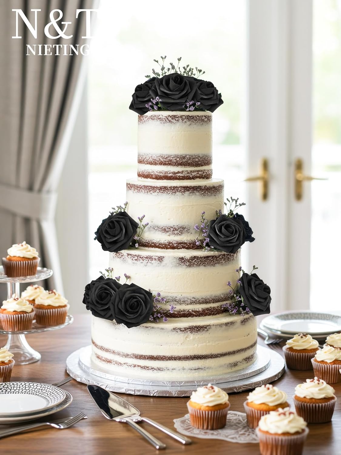 N&T NIETING Artificial Flowers Black Rose 25pcs Real Touch Flowers Perfect for for DIY Bouquets Wedding Party Baby Shower Home Halloween Decoration