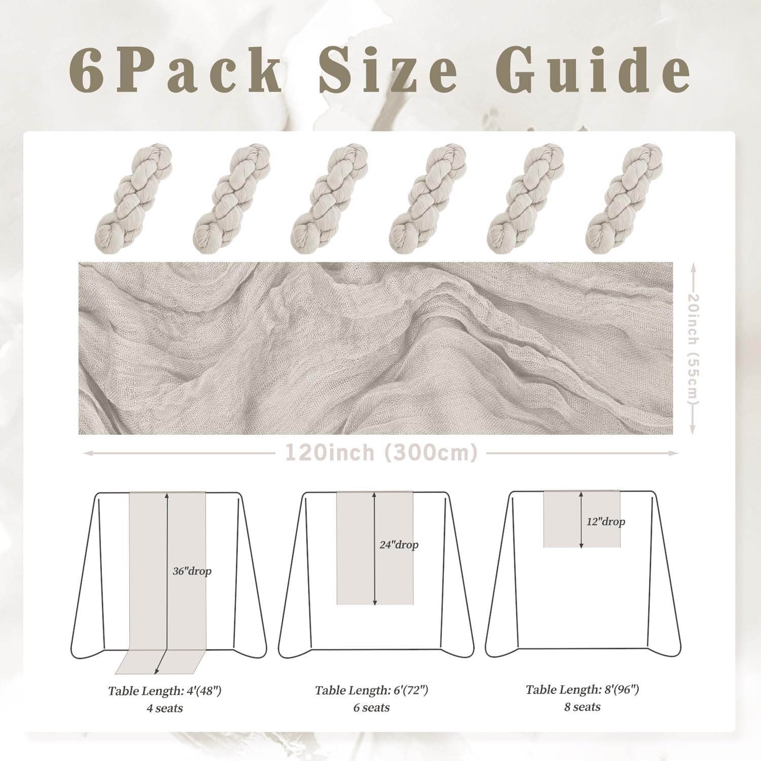 - Cheesecloth Table Runner Size: You will receive 6 rose brown cheesecloth tablerunner, each measuring 20 x 120 inches. The quantity is sufficient for you to decorate various romantic occasions. It can decorate most shaped tables, such as rectangular tables, round tables, and cocktail tables. It is long enough to decorate a large table and be placed perfectly and elegantly on the tabletop, adding a romantic atmosphere to your occasion.