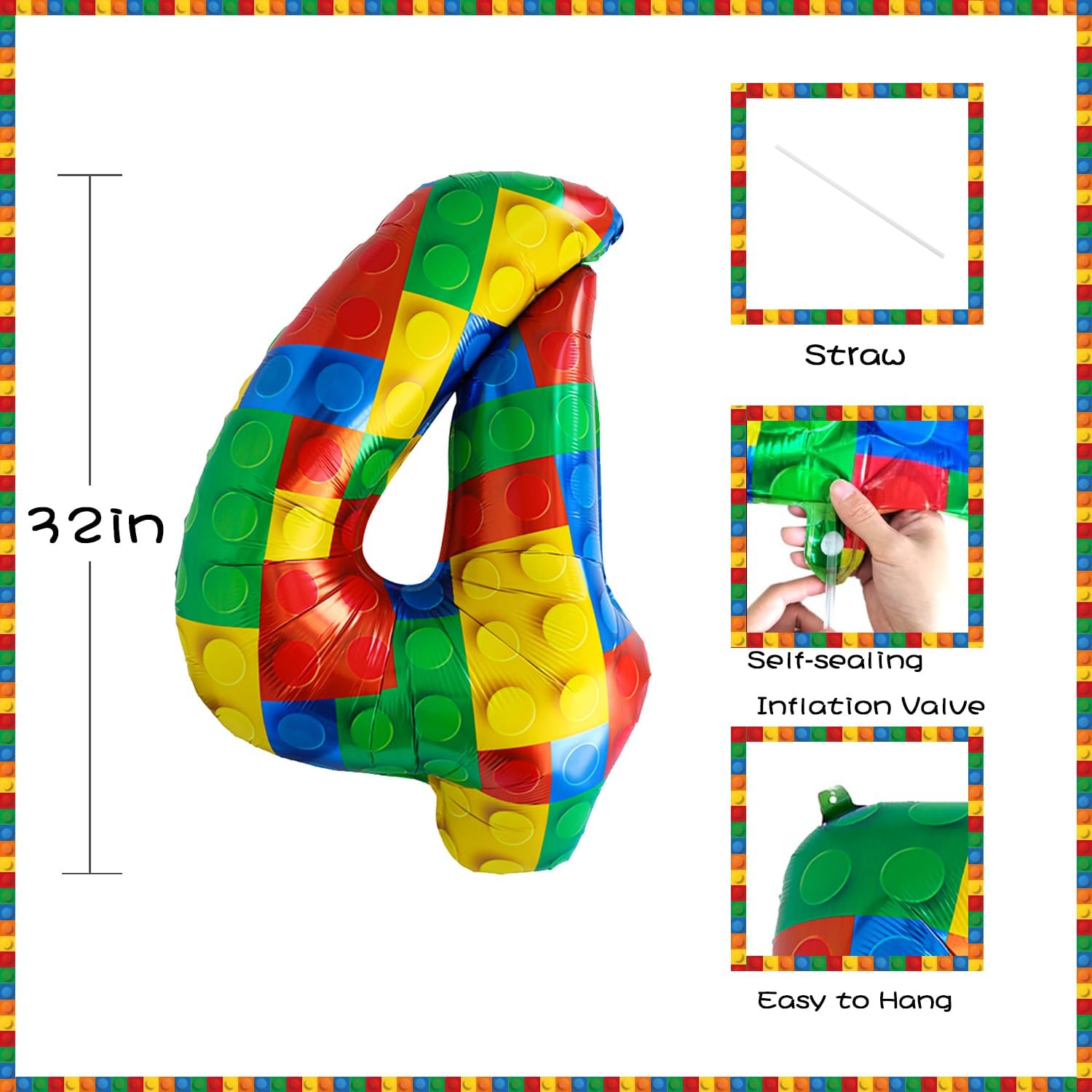 32 Inch Stackable Block Number Balloon – Colorful Brick Building Themed Big Helium Digits for Kids Birthday Party Decorations (Building Block, Number 4)
