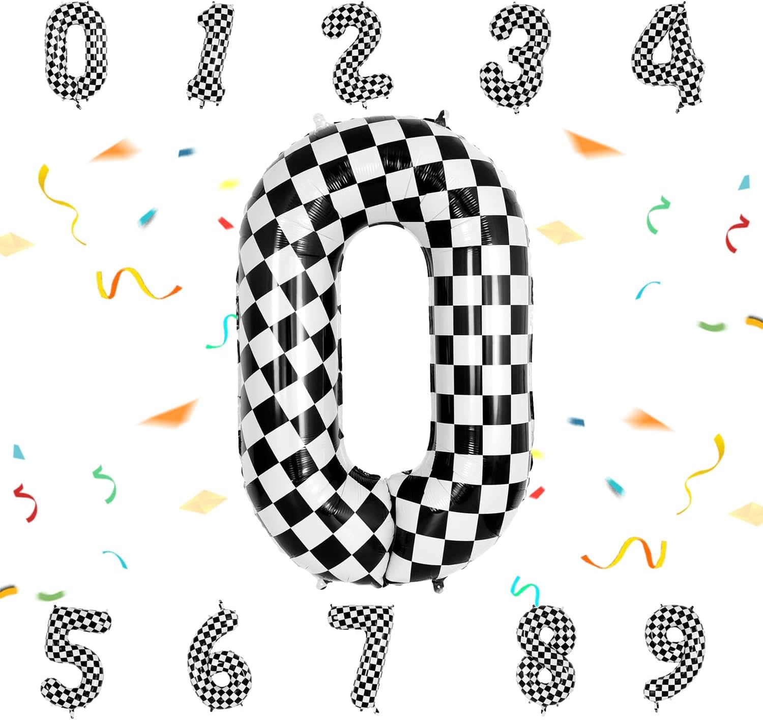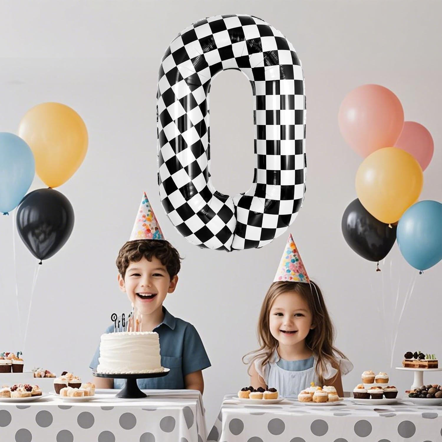 40 Inch Checkered Number Balloon - Race Flag Pattern Big Helium Balloon for Birthday Party Decorations - Black & White Balloon for Kids Adults Party Supplies (Racing Car, Number 0)