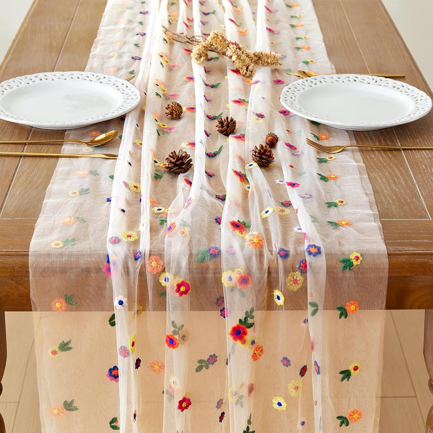 - Delicate Embroidery Daisy Design:This is a flower embroidered table runner. Daisy design and solid champagne gauze combination of both retains a sense of simplicity and add some full of life feeling!