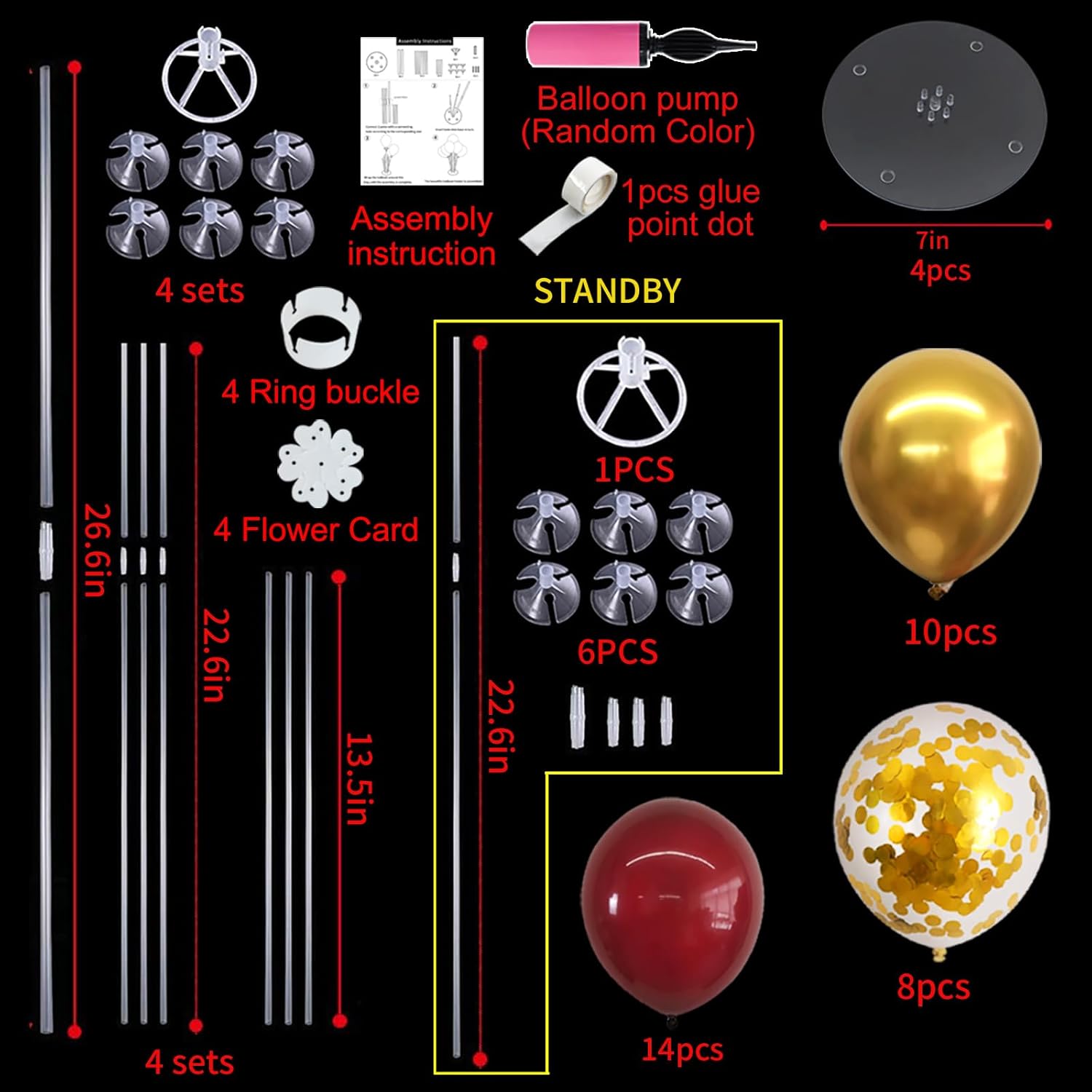 - Package Includes: The balloon arch kit includes 4 reusable balloon stands and 12 inch 32 pcs red and gold balloons(14 burgundy red balloons,10 gold balloons and 8 gold confetti balloons),glue point dots,balloon pump,balloon clips,and tie tool.You don’t need to waste money to buy balloons