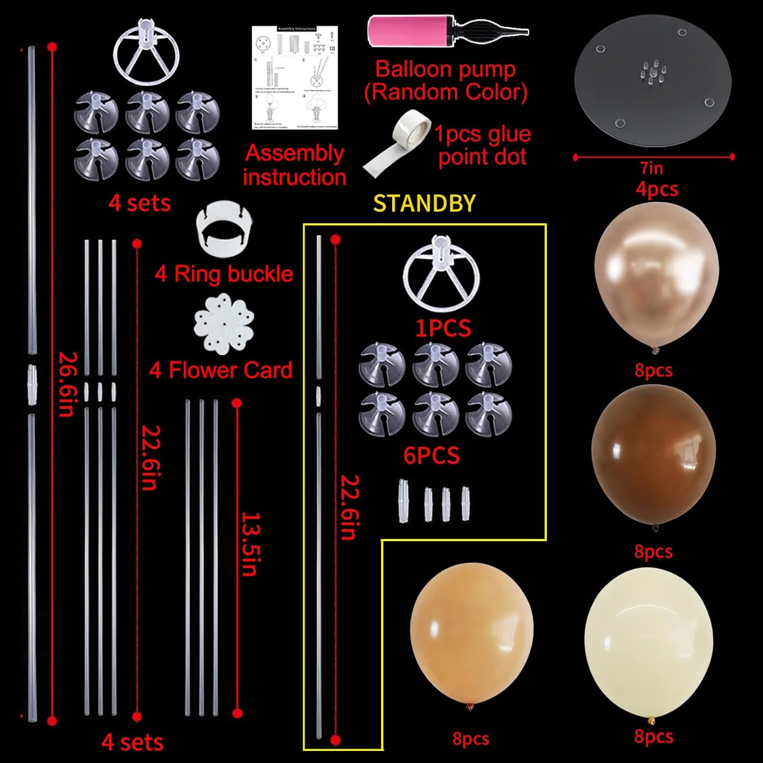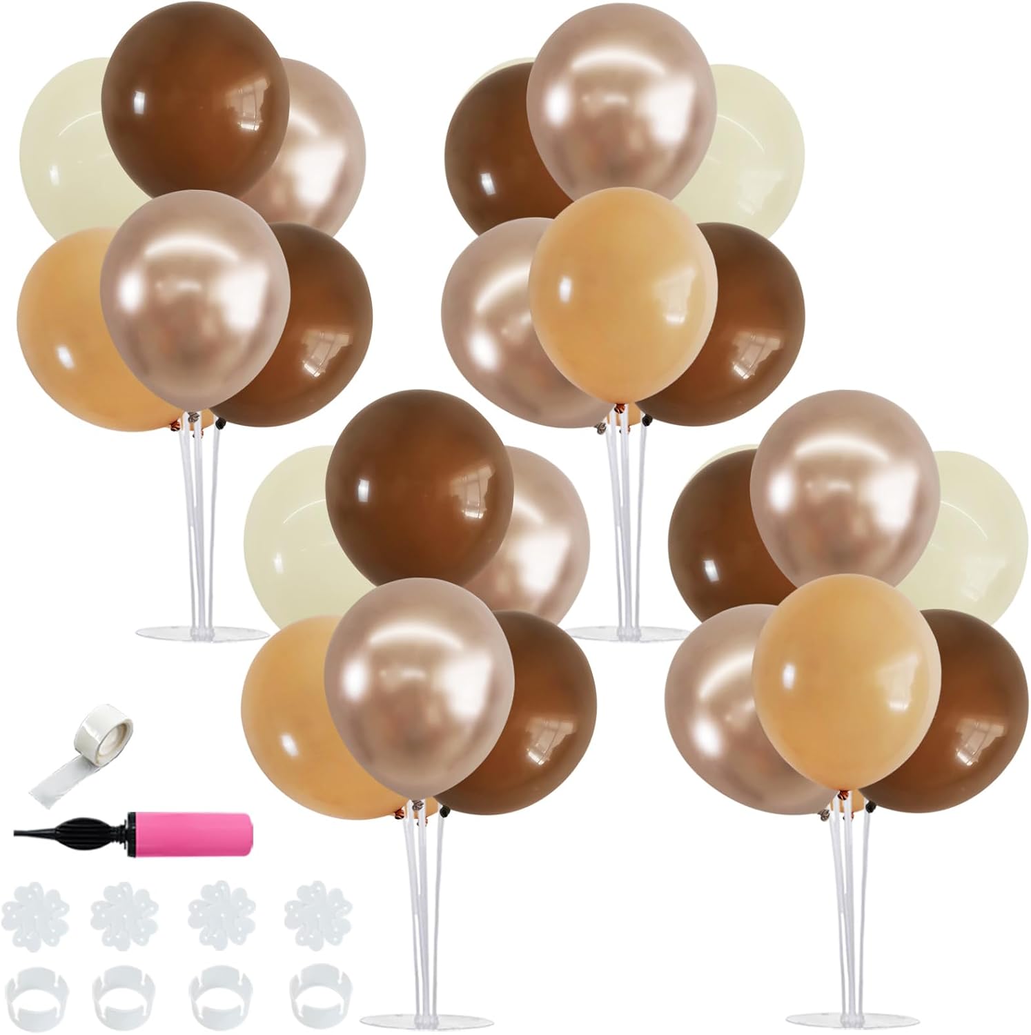 - Package Includes: The balloon arch kit includes 4 reusable balloon stands and 12 inch 32 pcs brown balloons(8 Apricot balloons,8 brown balloons,8 Ivory White balloons and 8 Metallic Champagne Gold balloons),glue point dots,balloon pump,balloon clips,and tie tool.You don’t need to waste money to buy balloons