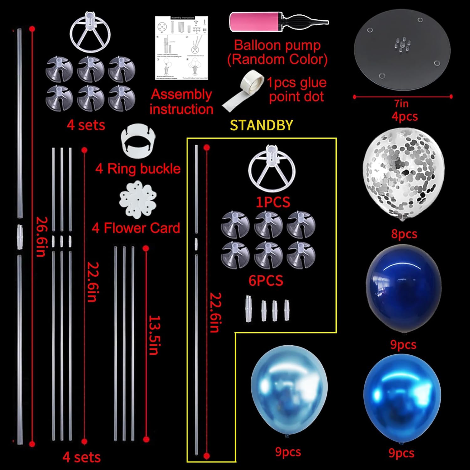 - Included Components : Balloon Stand, Filling Pump, Glue, Metallic Blue Silver Balloons, Tying Tool