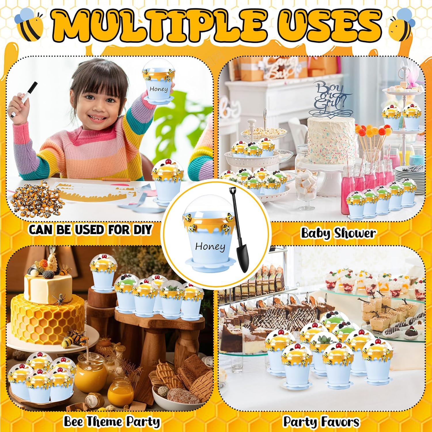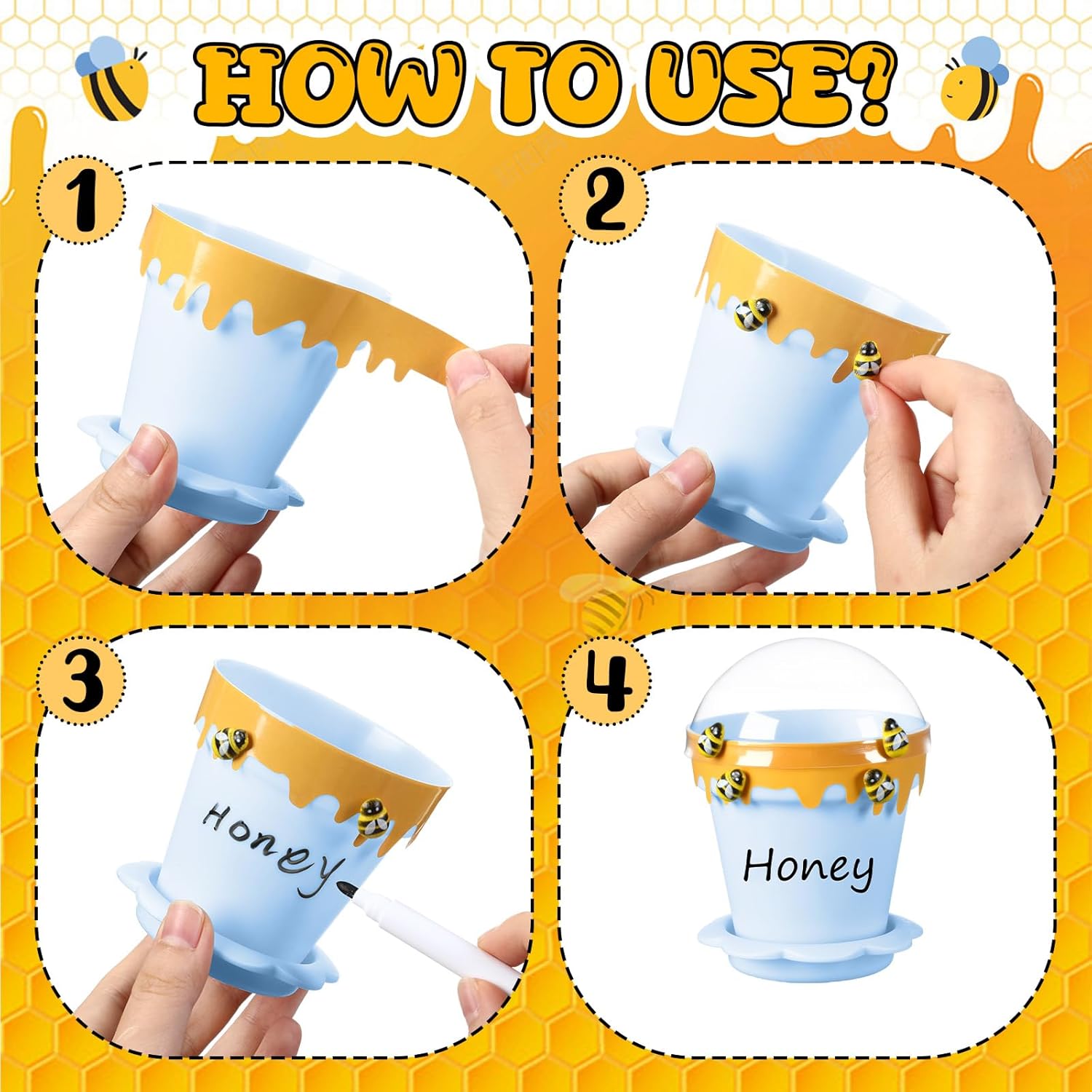 - Package Contains: includes 30 mini honey bee pots, 30 lids, 30 saucers, 30 shovel shaped spoon, 30 stickers, 120 wooden yellow bee decorations, 4 erasable markers, 2 indelible markers, ideal for DIY gifts, unleash your artistic talent to create a special and vibrant display, add fun to your bee party, birthday party, baby shower