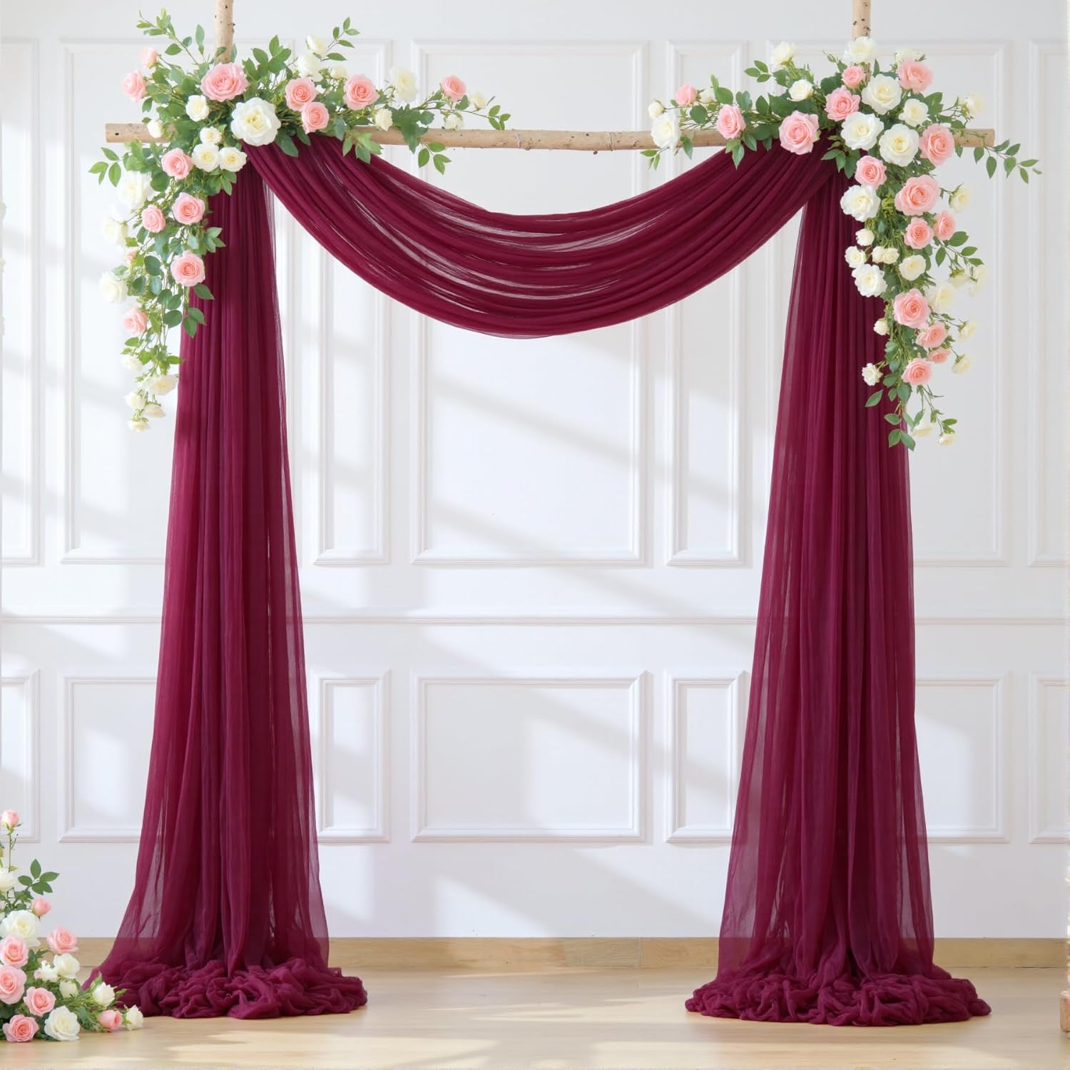 - Best Choice Wedding Arch: Package includes 1 panel burgundy wedding arch sheer drapes, each panel is 60 inches wide and 26 ft long. The drape of the fabric is perfect for use in a wedding arbor. These arch fabric add a pretty touch to pillars at a wedding.