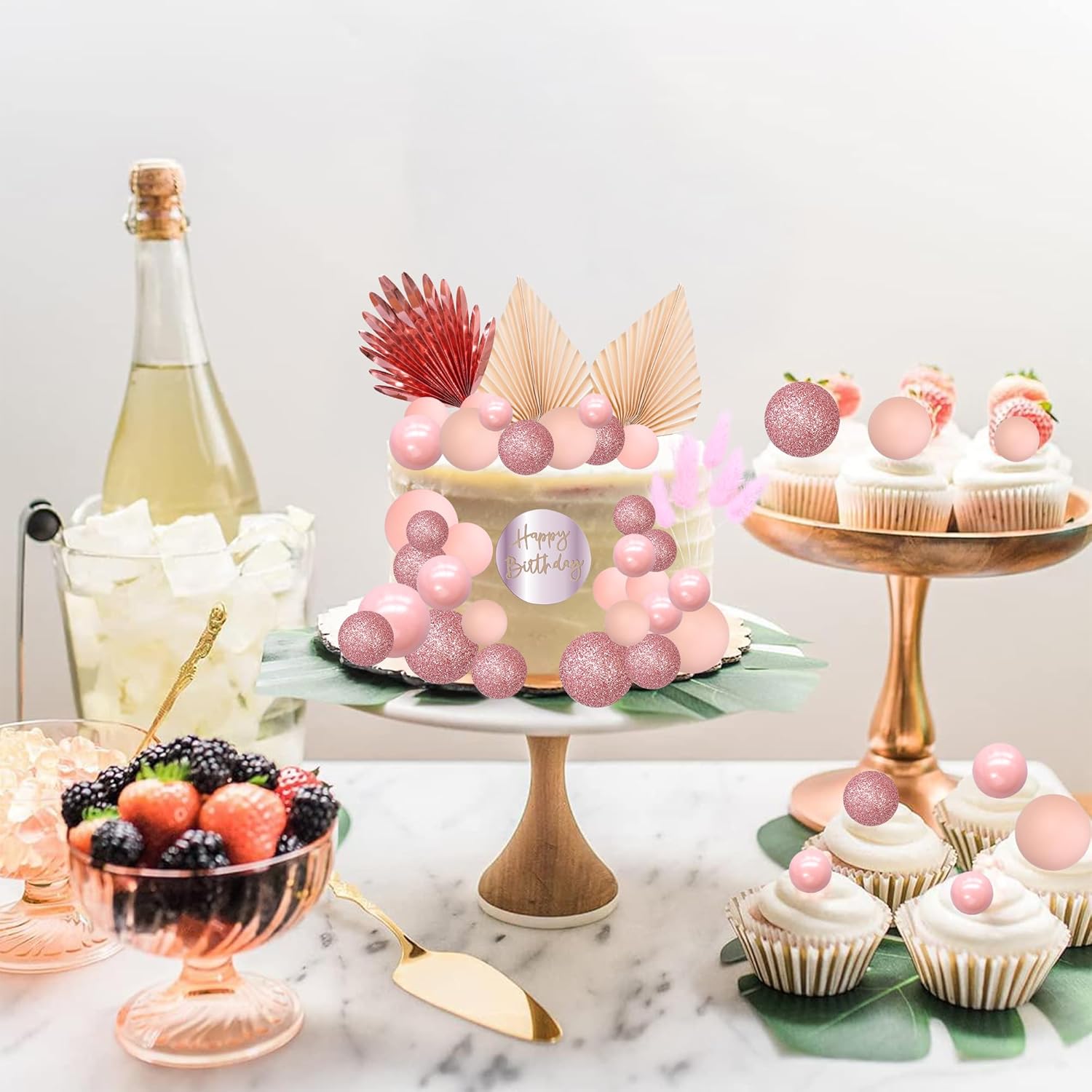 Ephlyn 33 Pack Balls Cake Toppers Boho Palm Leaves Cake Decorations Round Acrylic Happy Birthday Cupcake Toppers for Birthday Wedding Baby Shower Party Supplies Rose Gold