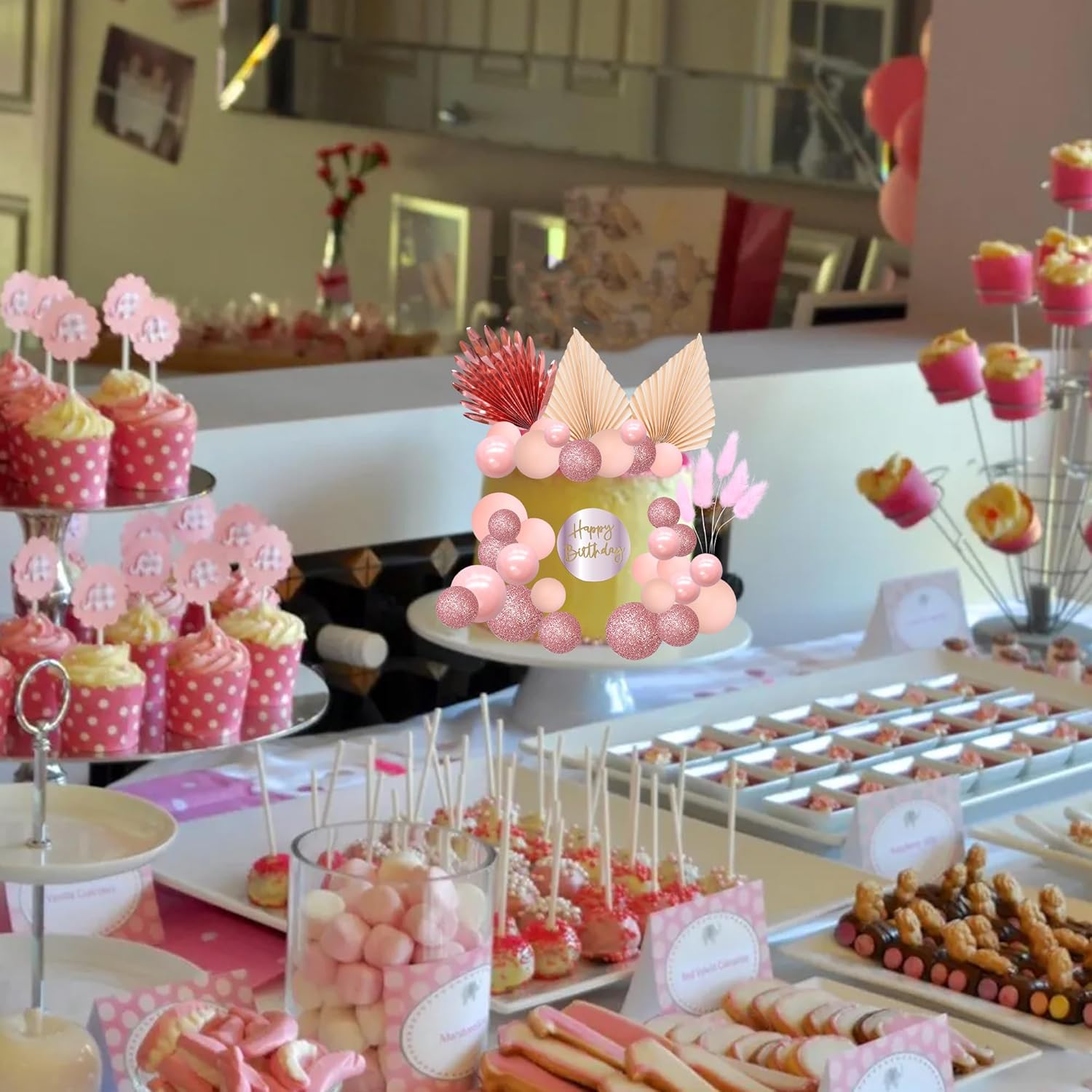 - 【Package Included】: 3Pcs Plam Leaves Cake Toppers + 1Pc Acrylic Happy Birthday Cupcake Topper + 24Pcs Ball Cake Decorations + 5Pcs Rabbit Tail Grasses. These Balls Cake Toppers are very nice and enough quantity for your use. Perfect for boho theme birthday party!