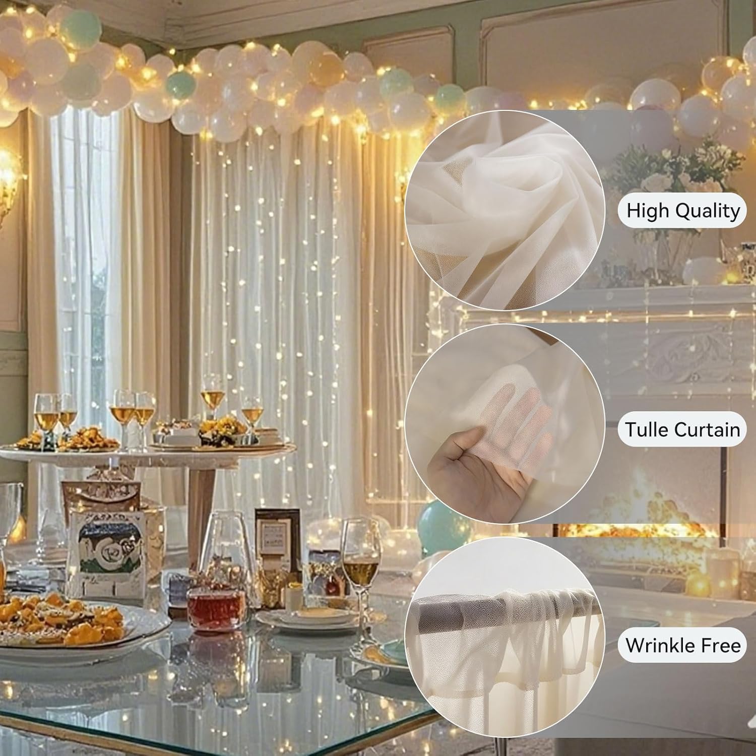10×8ft Tulle Backdrop Curtains with Lights String - 300LED Fairy Lights Sheer Curtain Backdrop for Weddings Baby Shower and Birthday Party Decorations(2 Panels 5×8ft)