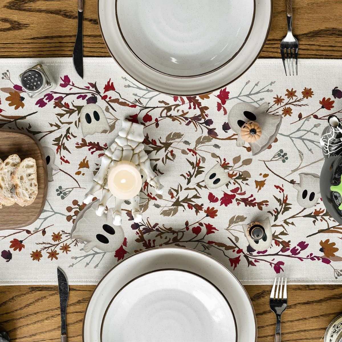 Artoid Mode Ghost Flowers Leaves 210 GSM Halloween Table Runner,Seasonal Fall Kitchen Dining Table Decoration for Home Party Decor 13x90 Inch