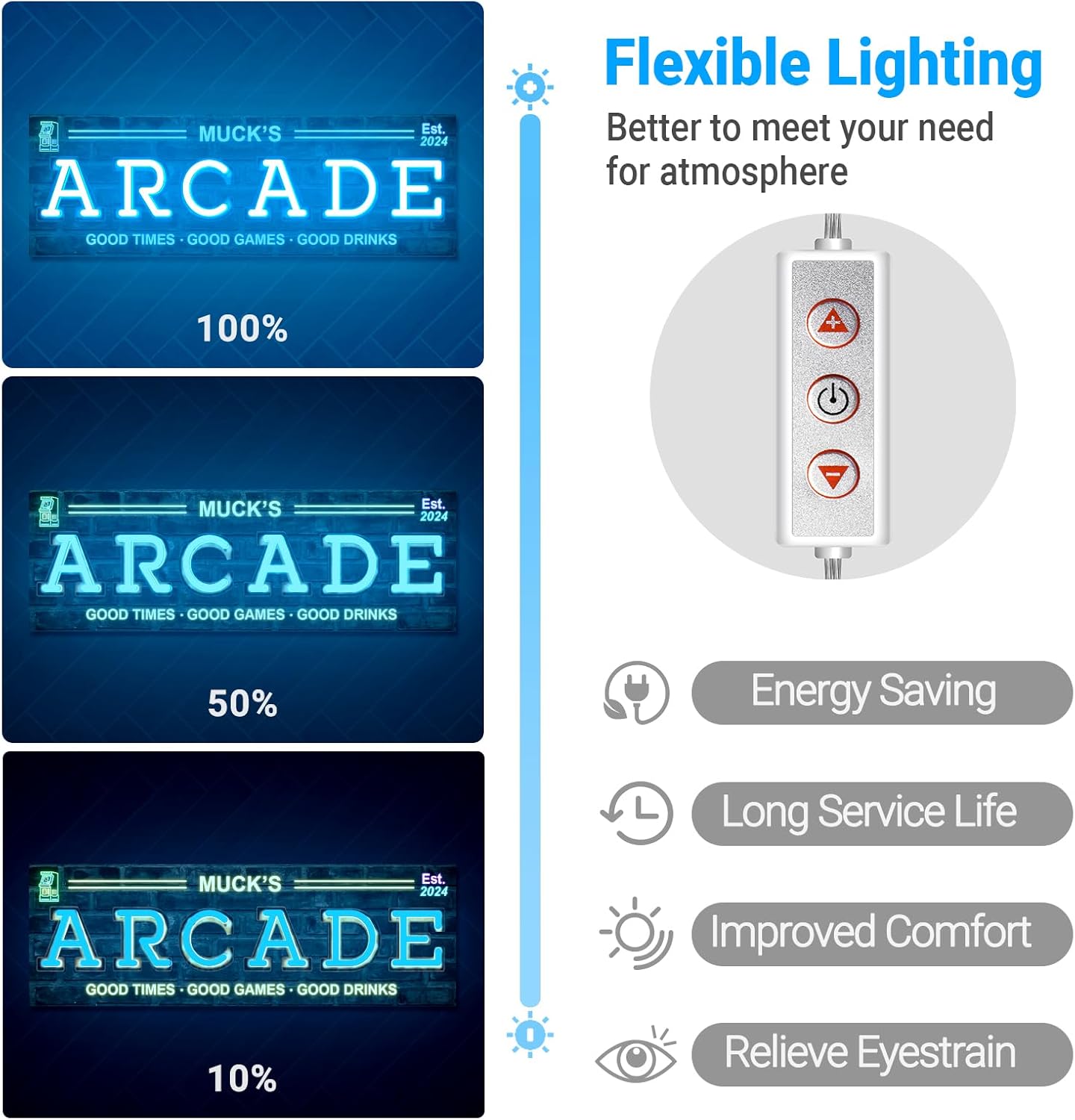 - 🌟【3D Engraving Process】Our customizable arcade neon signs feature a upgraded 3D engraving process, where custom text and graphics are etched onto a clear acrylic board. The stereo carvings are colorless and illuminated by vibrant colored LED neon strips that bring out the best 3D lighting, adding depth and brightness to turn any wall into a personalized artwork.