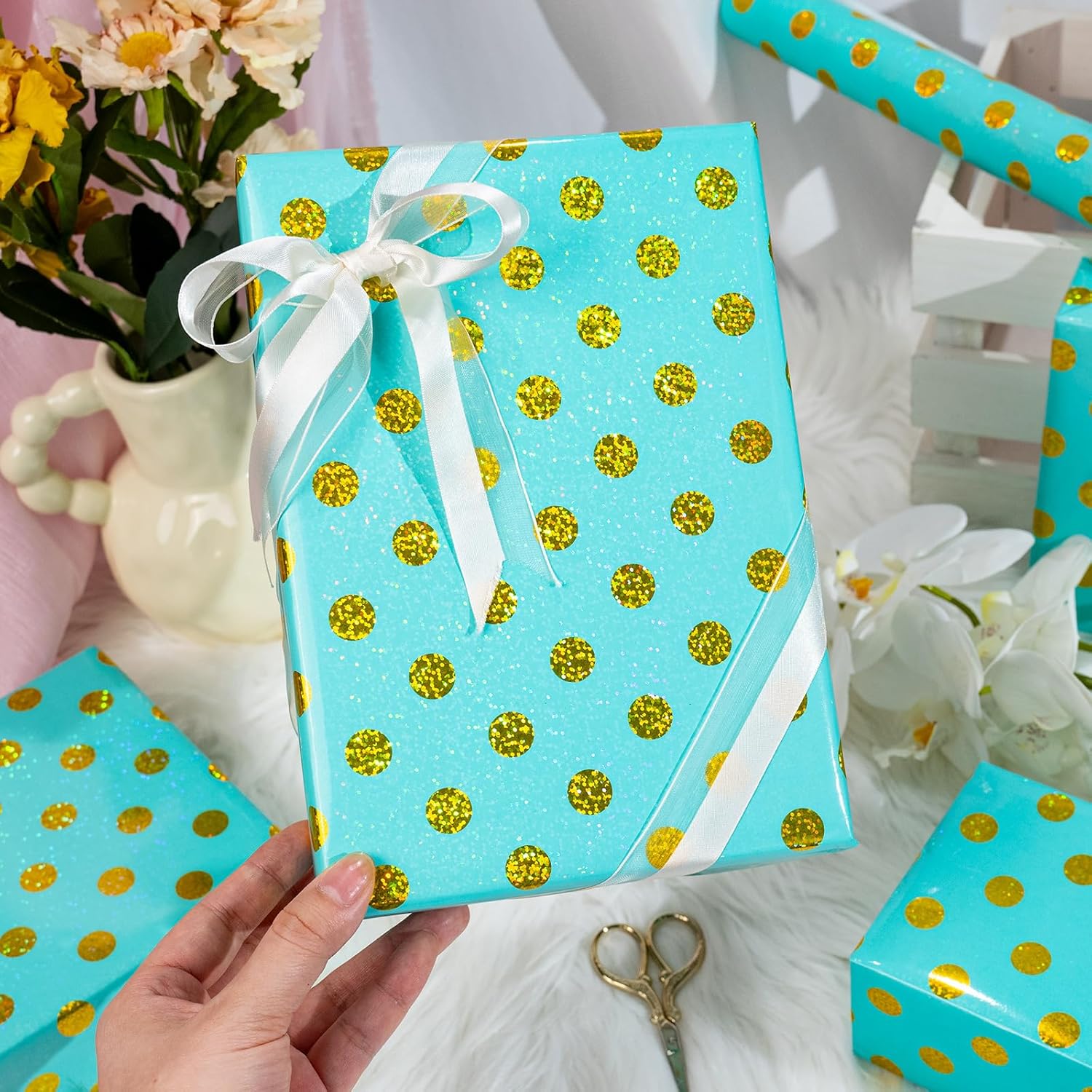 Burymento Blue Holographic Dots Wrapping Paper, Reversible Gold Gift Wrap for Birthday, Valentines, Mothers day, Graduation, Wedding, Fathers day, Baby Shower, Christmas (17in x 16.4ft)