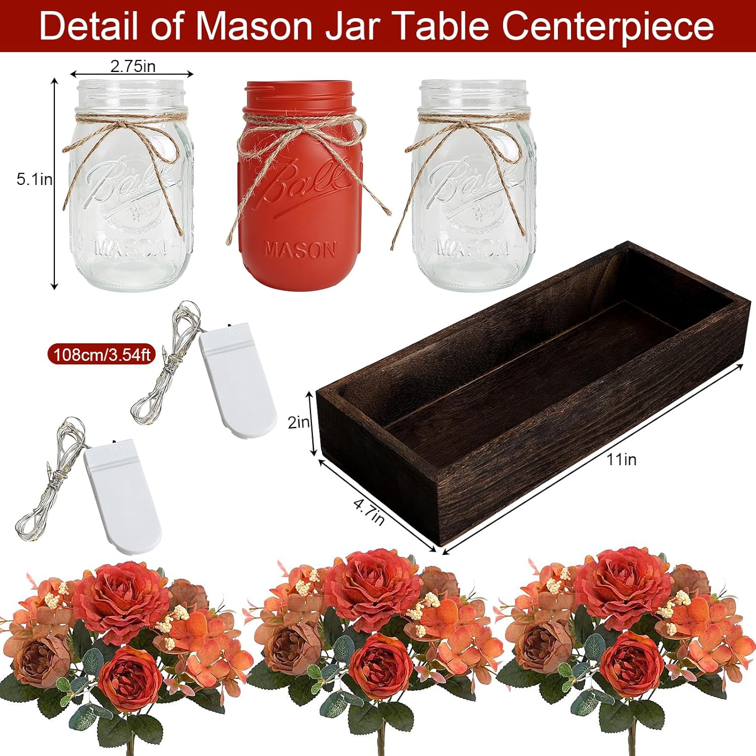 - Curated for Effortless Styling: The wooden box measures 11"L×4.7"W×2"H, jars are 2.75"W×5.1"H, and LED fairy lights are 3.54 ft long. No assembly needed—just place, light, and let the mason jar table centerpieces work their magic.