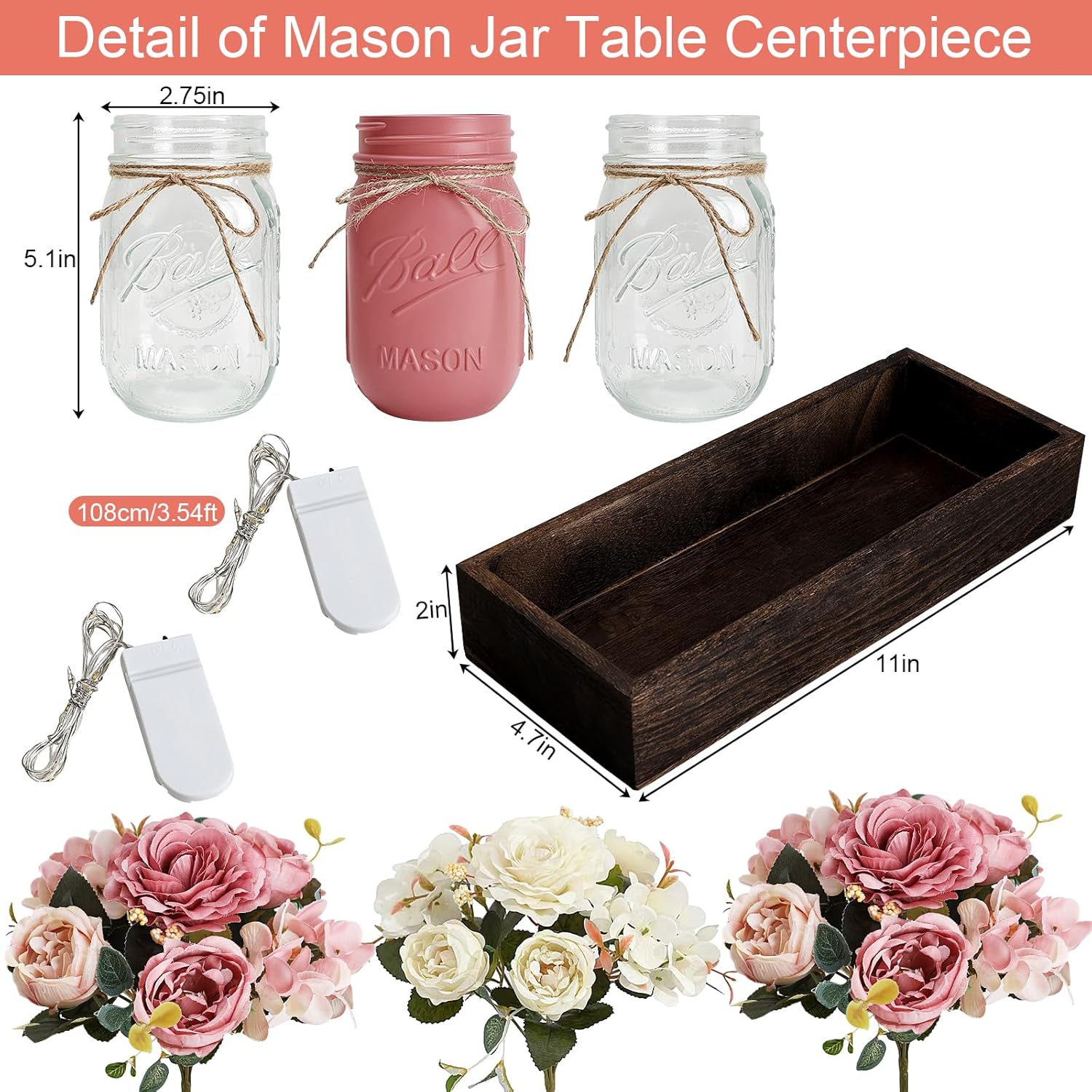 - Curated for Effortless Styling: The wooden box measures 11"L×4.7"W×2"H, jars are 2.75"W×5.1"H, and LED fairy lights are 3.54 ft long. No assembly needed—just place, light, and let the mason jar table centerpieces work their magic.