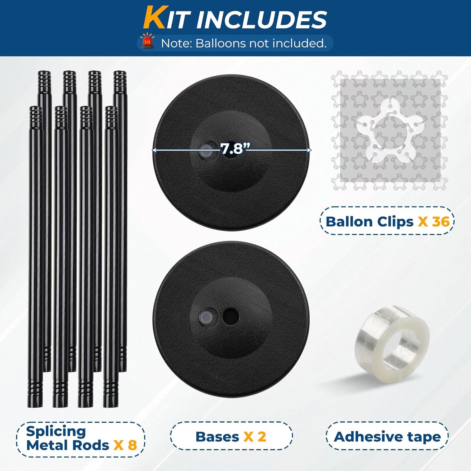 - ✅ Balloon Pillars Stand Kit Includes: 2 bases, 8 rods (each 15.7 inches long), 36 balloon clips, and 1 roll of balloon tape. Note: Balloons are not included.