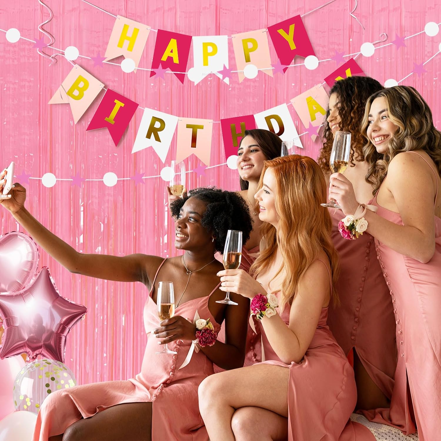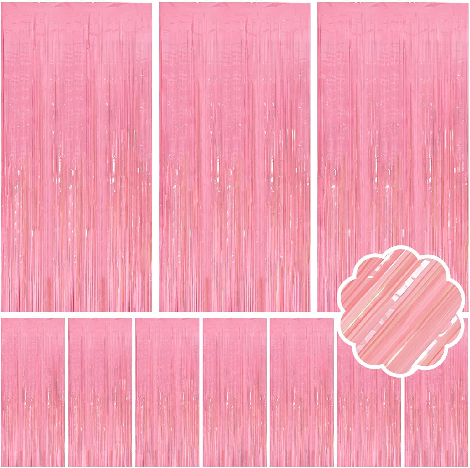 - Pink Fringe backdrop Set (10-Pack): Each dazzling curtain measures 3.28ft x 6.56ft – perfect for doors, walls, or photo booths! These extra-long foil streamers instantly transform any space into a party-ready celebration zone. Mix, layer, and customize your decor for the best results.