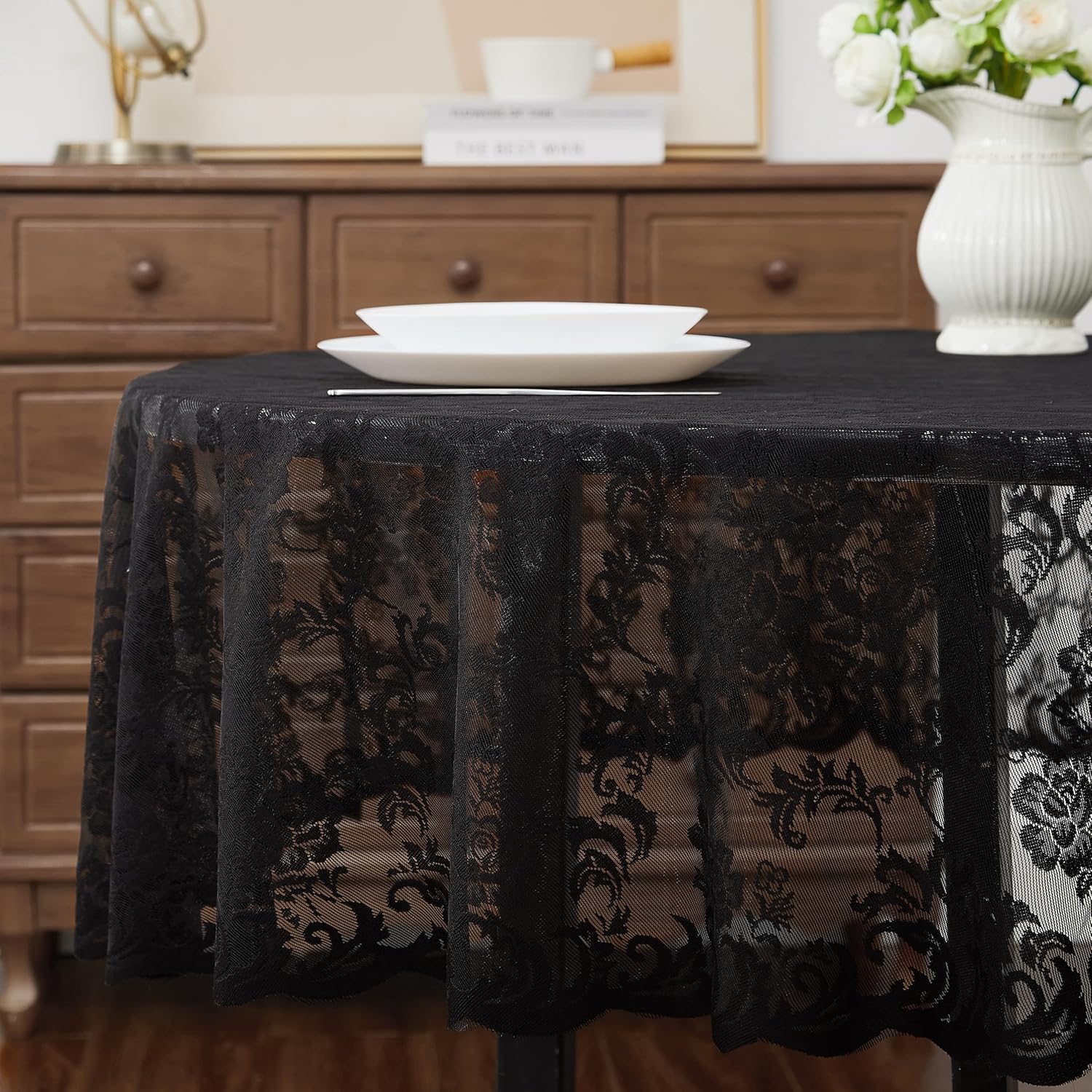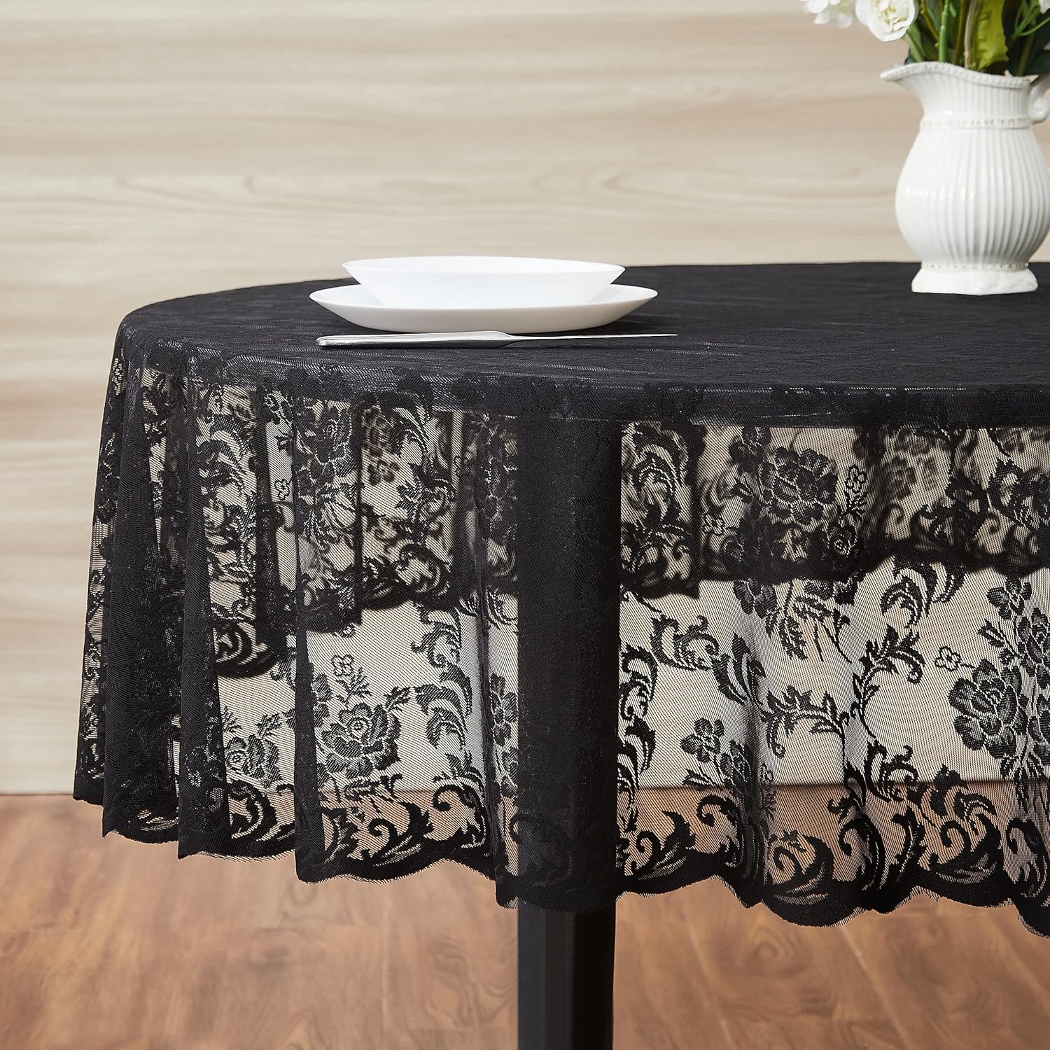 LinenZone Black Round Tablecloth for Rustic Vintage Decor. Sheer Lace Table Cloth Works Great As Wedding Tablecloth or Thanksgiving Table Cover. (Mia 60 Round, Black)