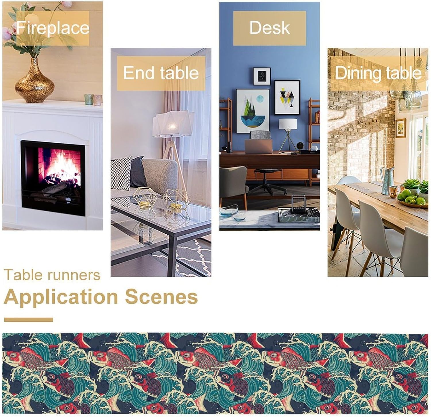 Kio Fish Table Runner Waves Japanese Tradition Art Printed Burlap Runner Home Kitchen Dining Table Living Room Decor Fabric 1 Panel W13xL70in