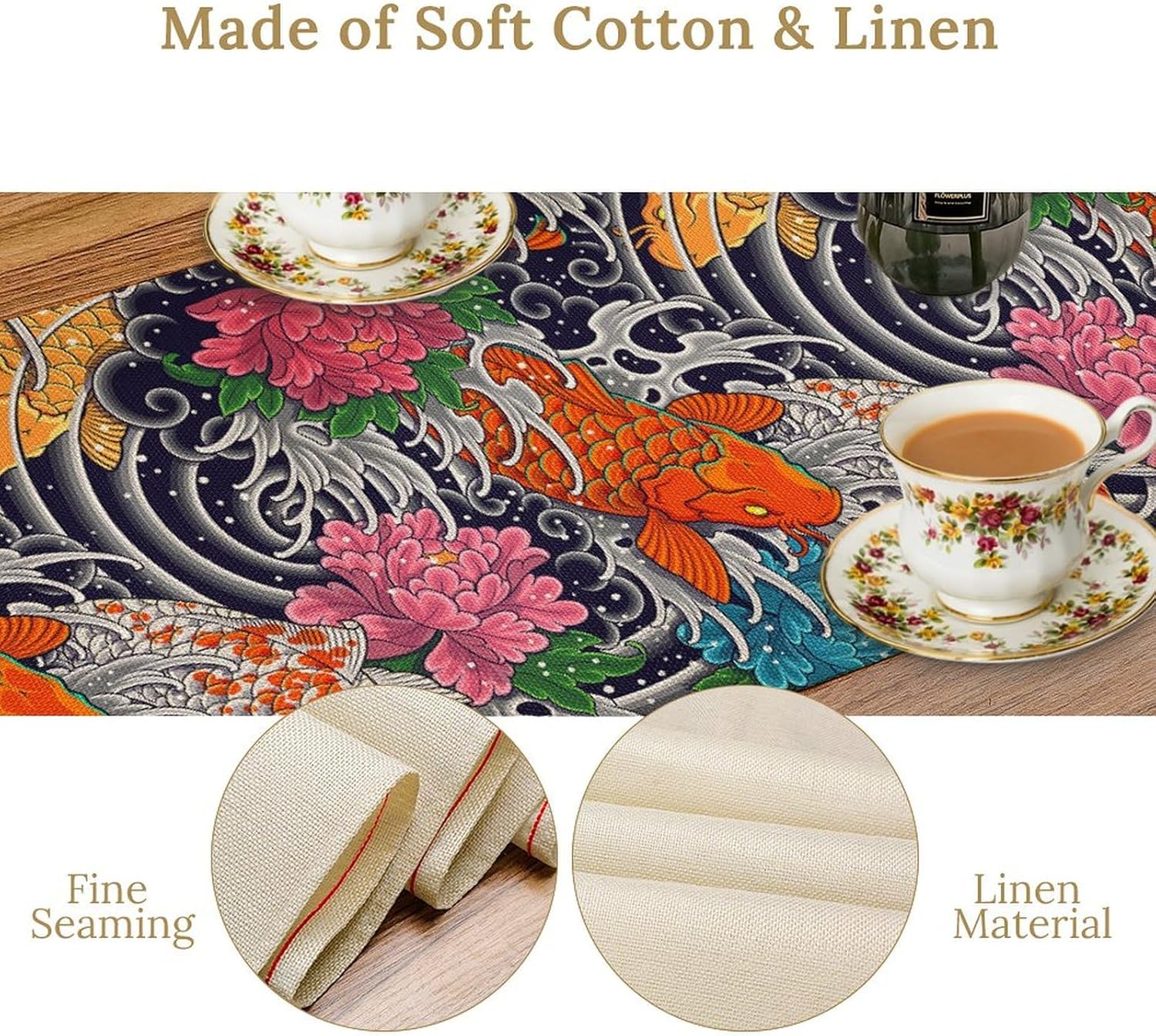 Japanese Retro Flowers Table Runner Oriental Tradition Kio Fish Art Printed Burlap Runner Home Kitchen Dining Table Living Room Decor Fabric 1 Panel W13xL60in