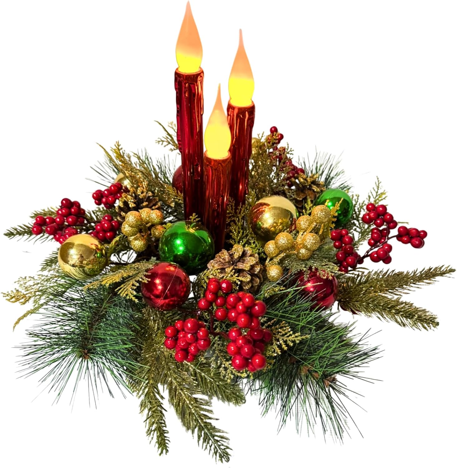 - All-in-One Festive Glow: Instantly create a warm holiday atmosphere with this beautiful 15-inch centerpiece. It comes complete with three integrated red LED taper candles, eliminating the need to buy separate candles and ensuring a perfectly coordinated, ready-to-display decoration