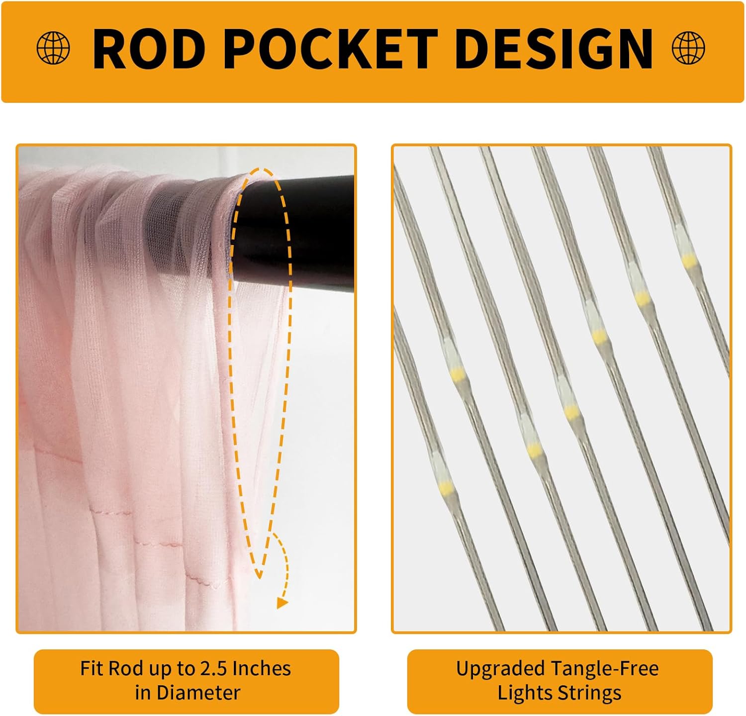 - Elegant Combination of Tulle Backdrop Curtains and Lights - Package Includes: 2 panels pink sheer tulle backdrop curtains (5ft x8ft each, total 10x8ft).1 set of a 10x8.2ft warm white USB-powered tangle-free string lights (10 strands with 250 LEDs). 12 Transparent clips for hassle-free Installation. (Pro Tip: Buy multiple sets for fuller coverage and reduced sheerness!)