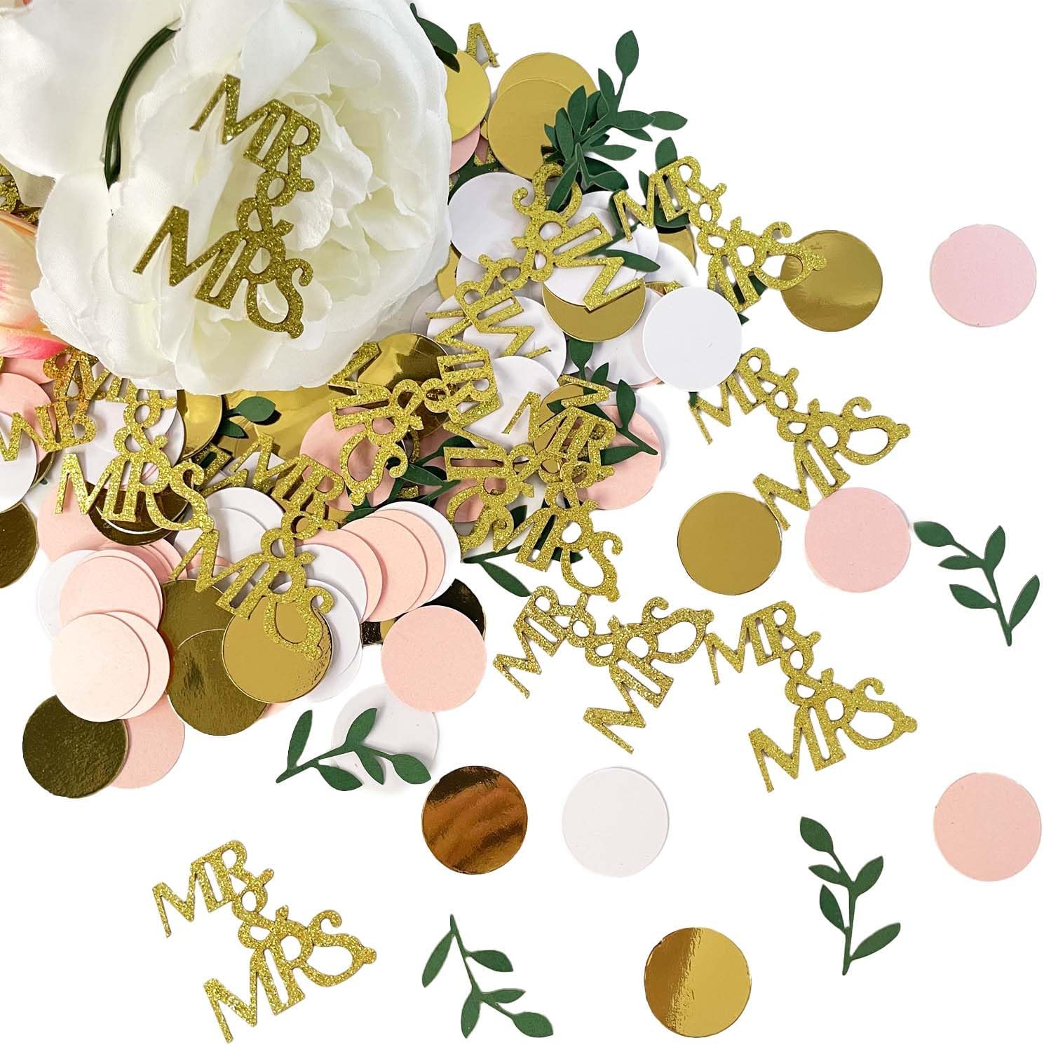 - PACKAGE INCLUDES-- gold glitter mr mrs table scatter, greenery Eucalyptus Confetti, gold conffeti dots, pink confetti dots, White confetti dots
