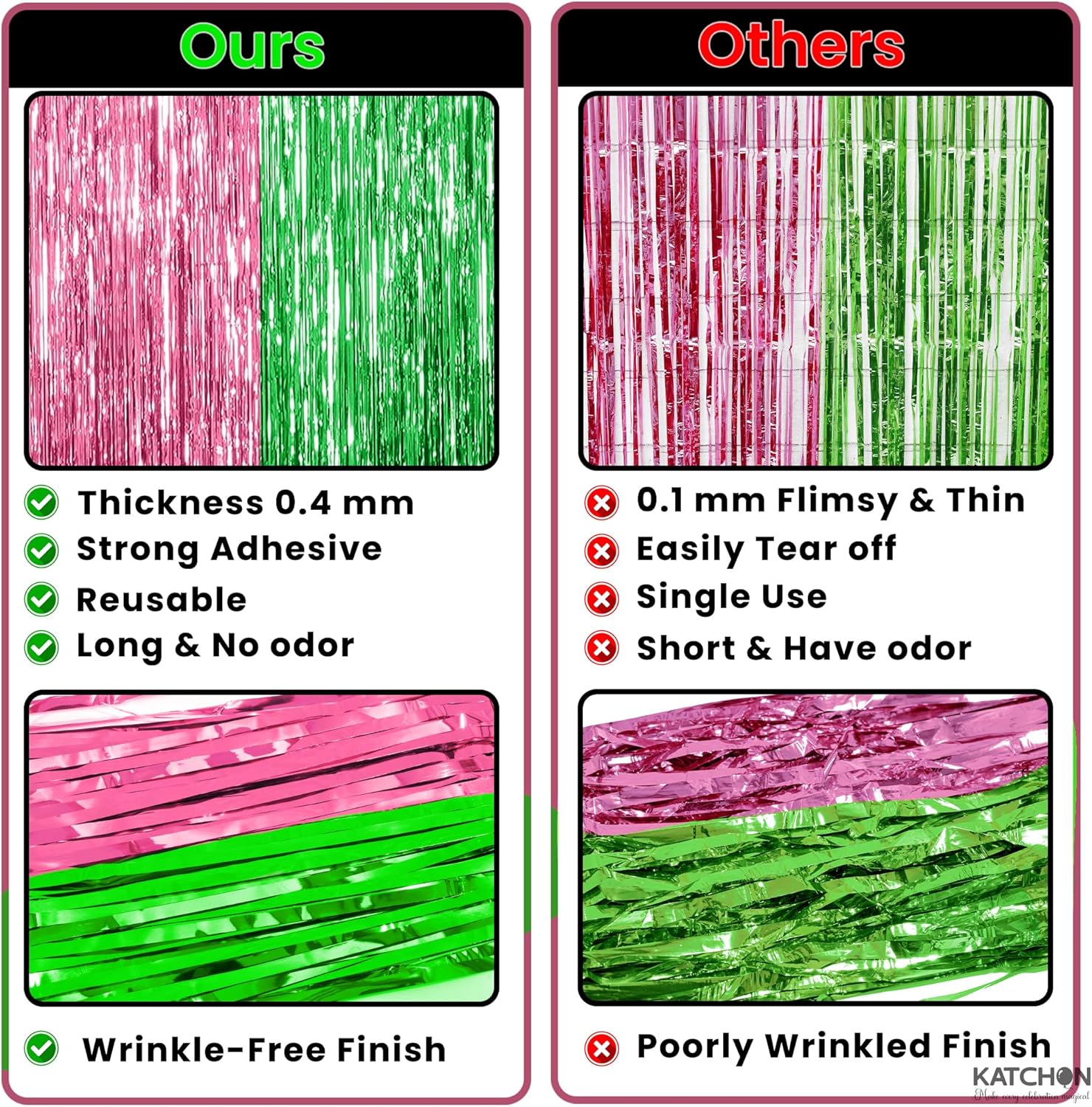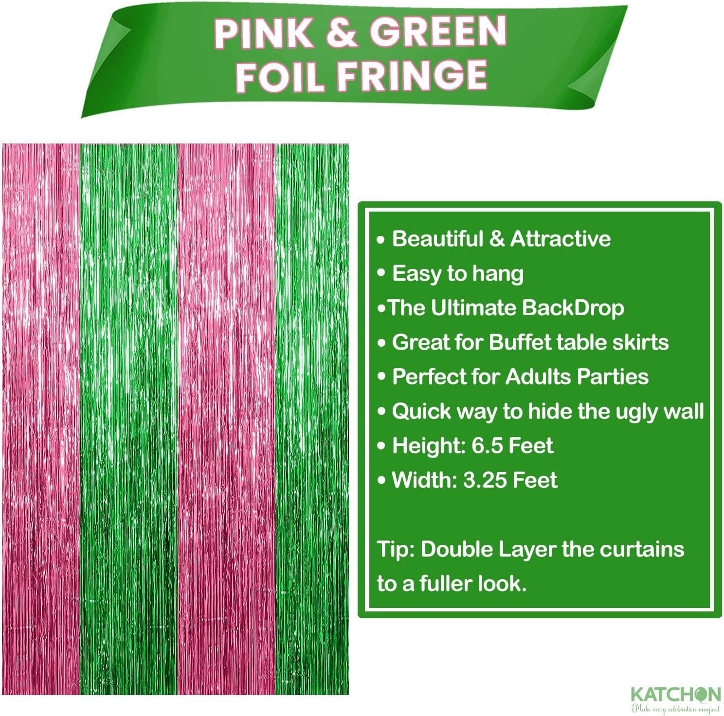 - 3.2X6.5 FT LARGE SIZE PACK OF 2 PINK AND GREEN FOIL FRINGE CURTAINS –: This pack includes pack of 2 pink and green foil fringe curtains made of shiny metallic foil. Each measures 3.2 ft wide by 6.5 ft tall, creating a vibrant pink and green backdrop for pink and green party decorations, green and pink birthday decorations, baby shower backdrop ideas, and princess birthday party decorations. Use as a pink tinsel backdrop, pink fringe, tassel backdrop, or party streamers backdrop.