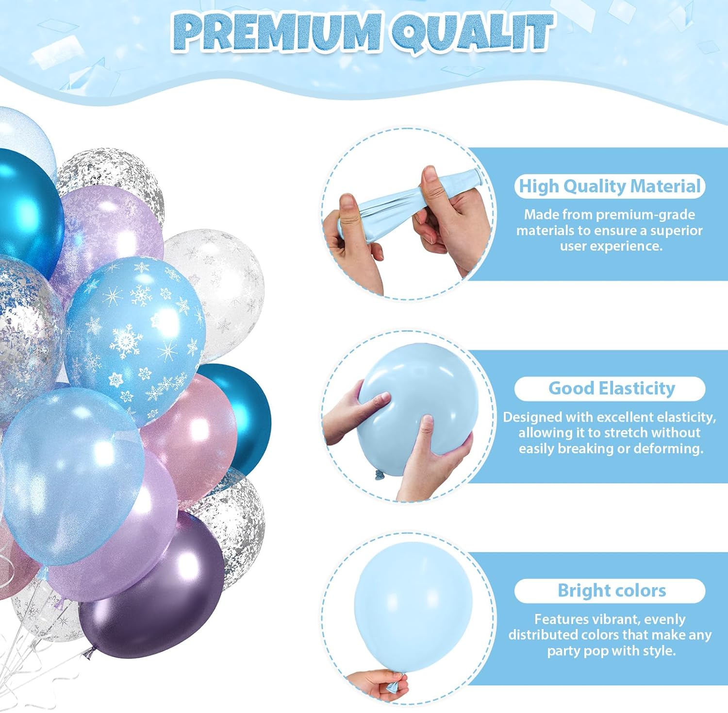 - Versatile for All Celebrations: The metallic purple blue balloons set includes clear balloons printed with white snowflakes, adding a whimsical touch that fits perfectly with winter. Pair them with metallic solids and confetti-filled balloons to bring a layered, enchanting effect to any space.