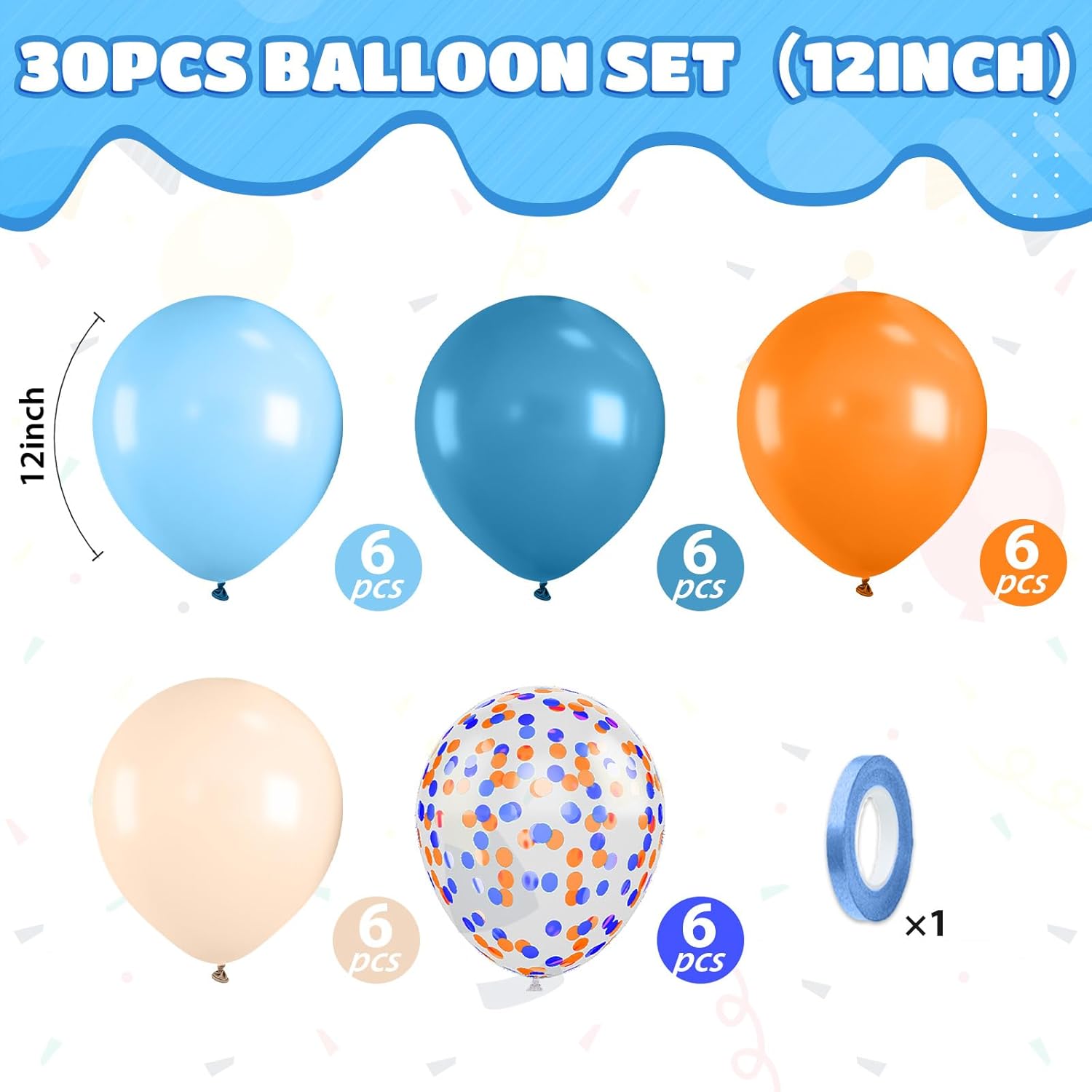 - 【12 Inch Orange and Blue Balloons Set】Orange balloons (6 pcs),retro blue balloons (6 pcs),light blue balloons (6 pcs),apricot balloons (6pcs),orange and blue confetti balloons 6 pcs),blue balloon ribbon (1 roll), 30pcs in our dusty blue balloons set. Suitable for decorating various occasions, such as boys blue theme party birthday baby shower anniversary graduation wedding.