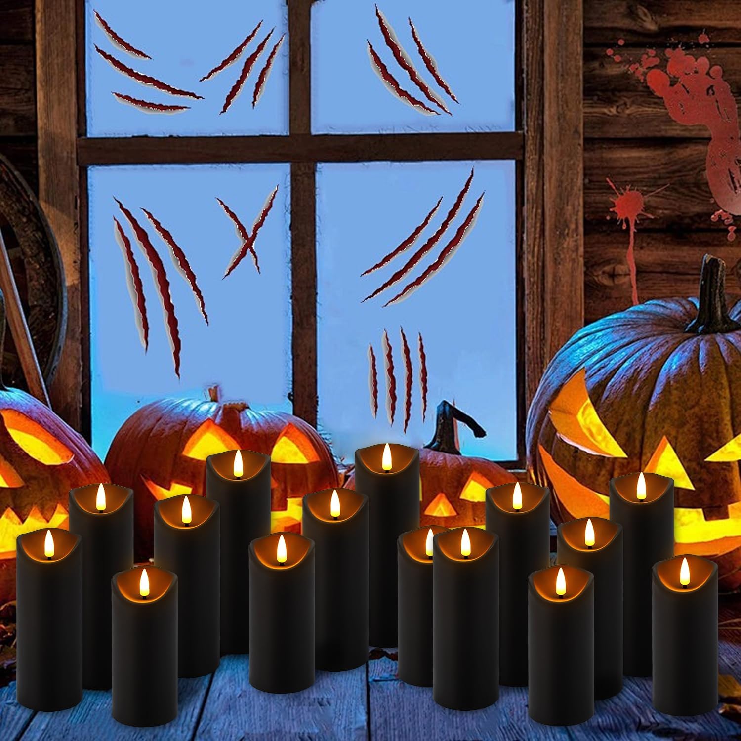 24-Pack Black Flameless LED Candles with Remote & Timer (3 Sizes) - Battery Operated Halloween Pillar Candles for Spooky Decor, Haunted House, Gothic Wedding, Holiday Centerpieces