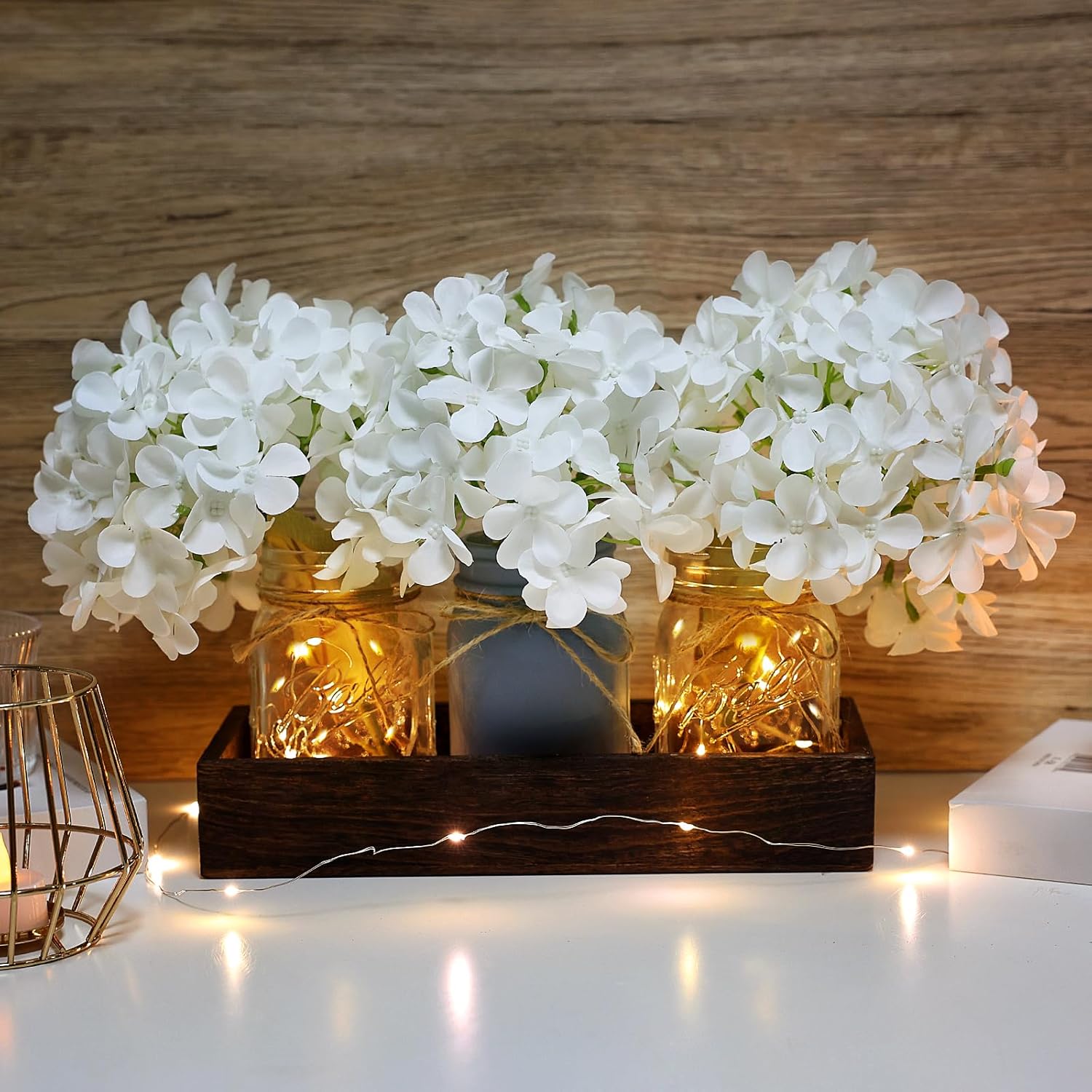 - Elegant Table Centerpiece Set: This rustic mason jar table centerpiece for dining room includes 1 wood tray, 3 glass jars, 3 faux hydrangea flowers, and 2 LED fairy lights (batteries included)