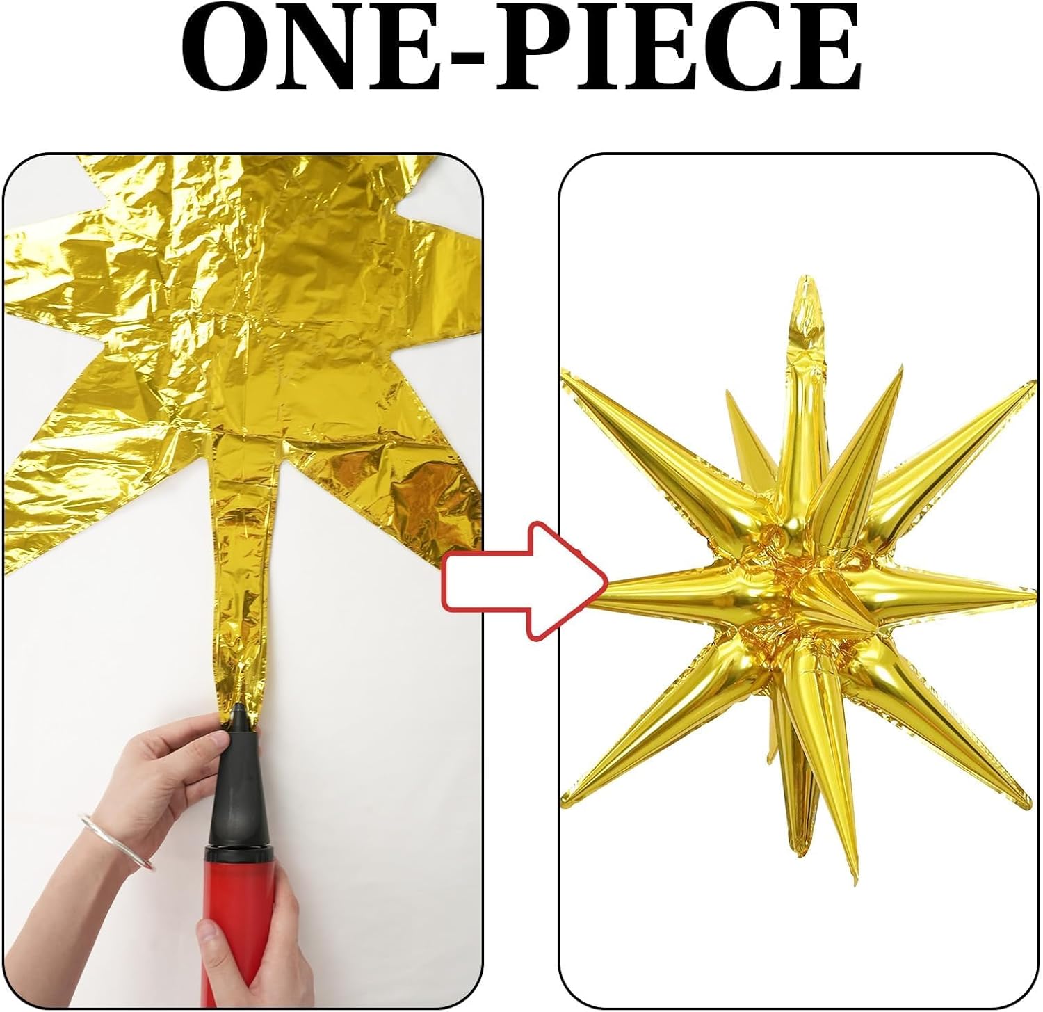 - One-piece Star Balloons: Includes 12pcs One-piece star burst balloons in bold colors: 3pcs × 27in , 3pcs × 22in explosion star balloons and 6pcs × 10in four angle star balloons. Arrives ready to use with 1 straw and 1 roll of ribbon—just inflate and decorate.