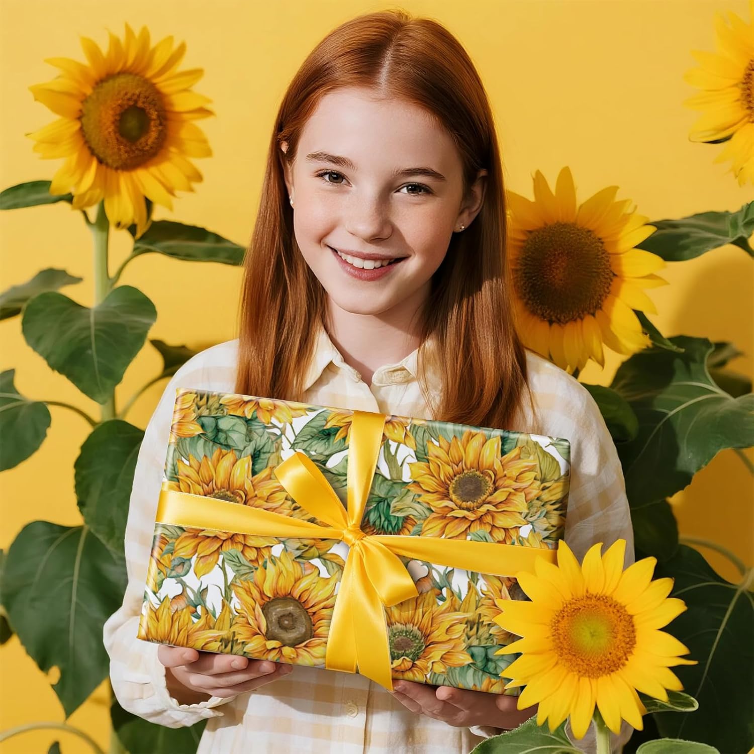 RUSPEPA Sunflower Wrapping Paper Roll for Women Girls, Mini Roll, Bright Yellow Sunflower Floral Design with Green Leaves, Cheerful Gift Wrap for Birthday, Wedding, Mother's Day, 17 Inches x 16.4 Feet