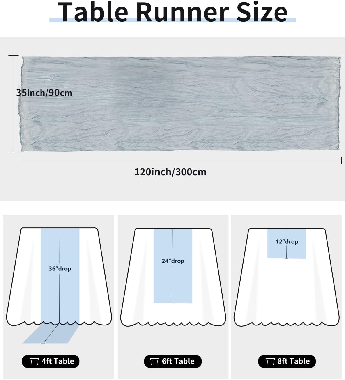 - Package : 1 dusty blue cheesecloth table runner (35” W x 120” L / 10 FT). Perfect for 6ft/8ft round or rectangular tables seating 8-10 people; can be used for long tables. It's also a great choice for decorating wedding arches and chairs.