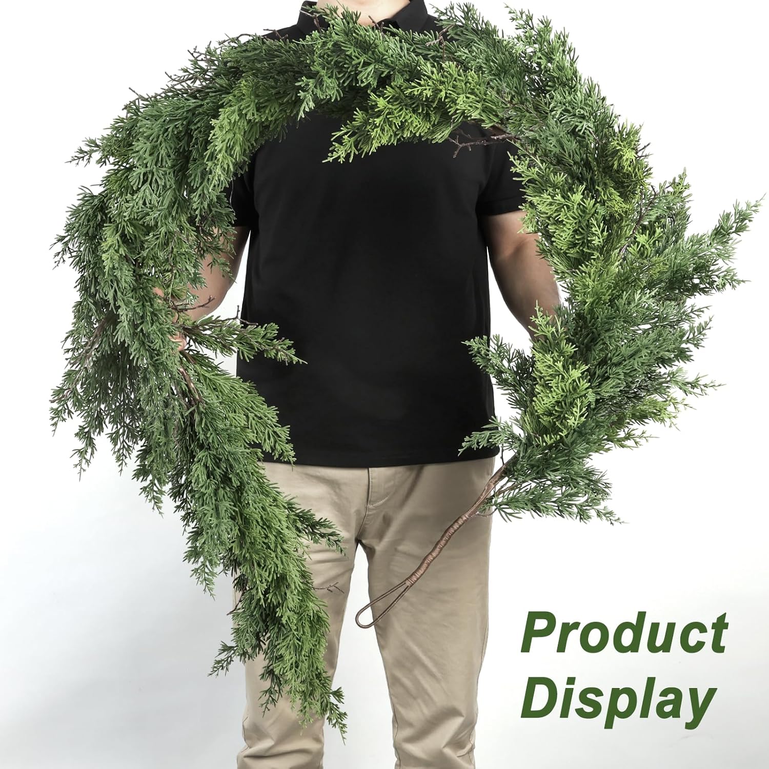 - Materials: Our Christmas garland is crafted from polyethylene (PE) for a lifelike appearance. This cypress garland features dense, soft, and flexible branches that can be easily shaped to your liking, with a ring hook designed for easy hanging