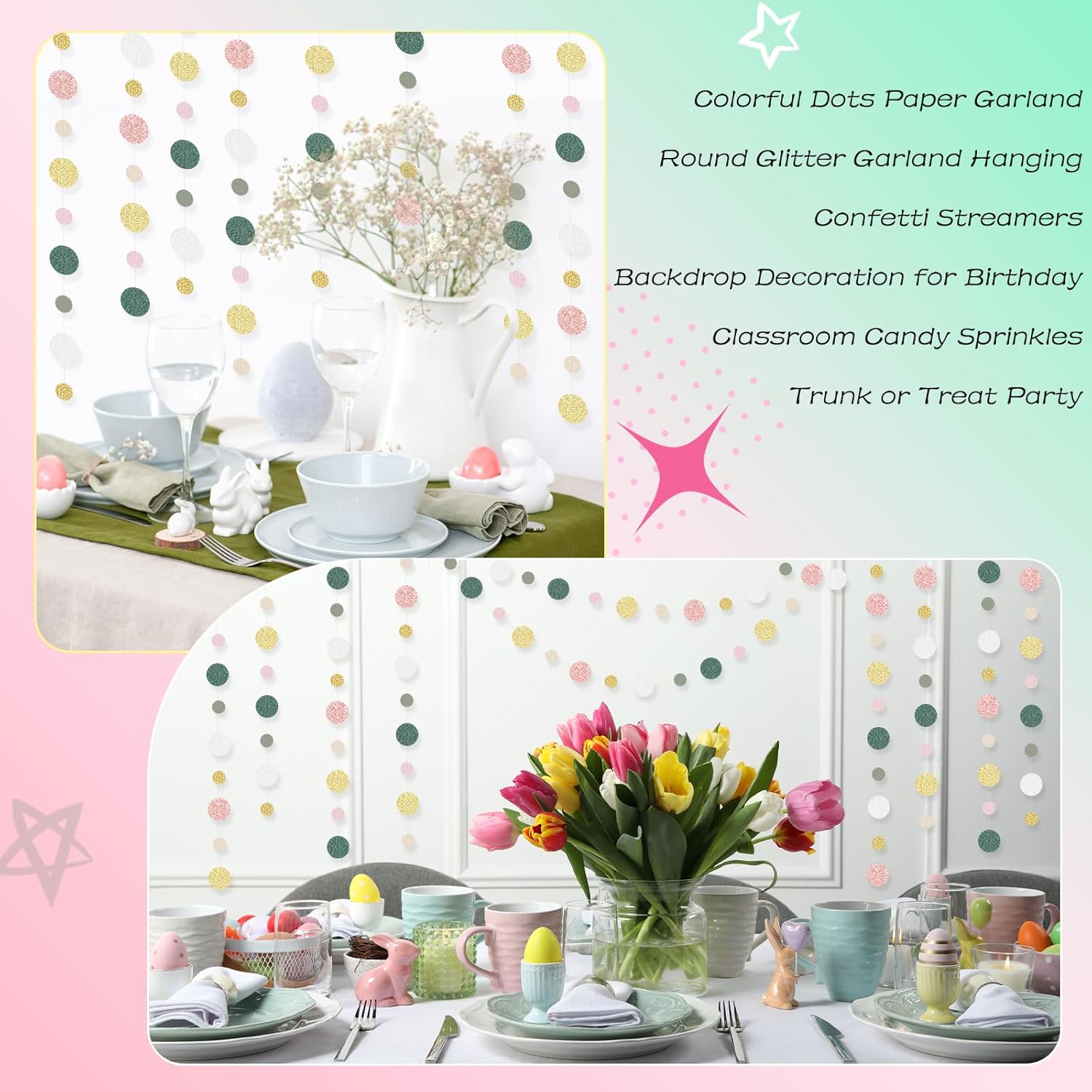 Outus 5 Pieces Colorful Dots Paper Garland Round Glitter Garland Hanging Confetti Streamers Backdrop for Candy Birthday Classroom Halloween Trunk or Treat Car Decoration (Sage Green,Pink,Gold)