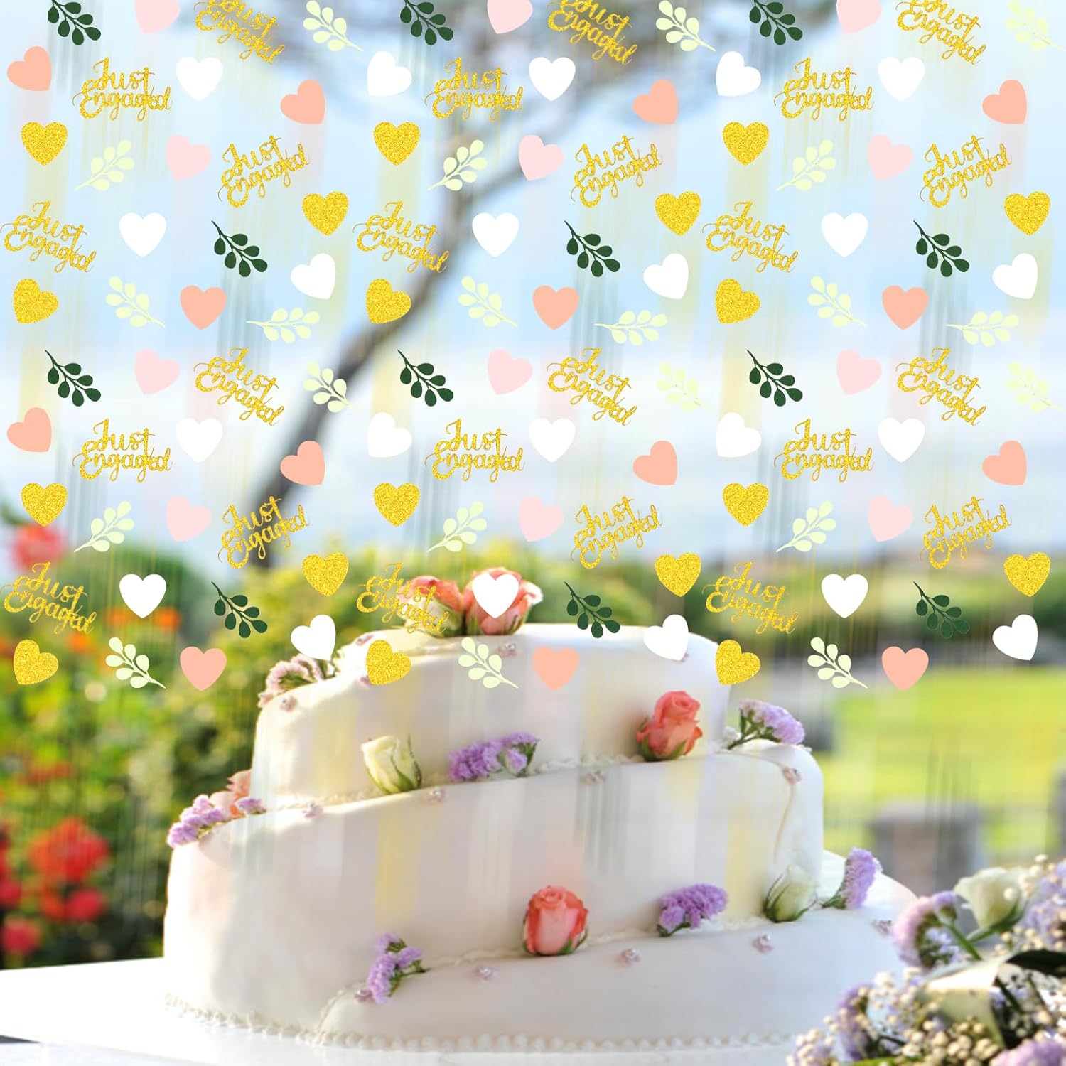 - 1.Elegant Color and Design-Great engagement party decor.The engagement confetti for tables match the sage green and pink gold white heart and greenery eucalyptus leaf with special gold glitter “just engaged” letters, which will show the unique visual impact and make the whole party warm and energetic.