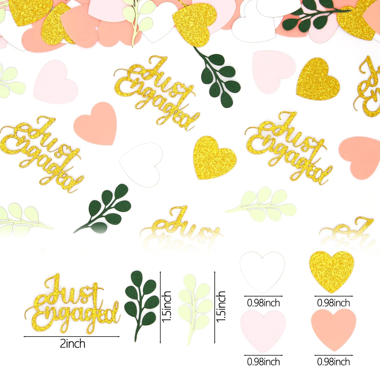 - 5.Proper Size and Premium Material.The heart confetti width 0.98inch,the sage leaves 1.5inch width,the just engaged letter 2inch width,looks perfect with premium fresh color papercard,adding a charming and energetic sense to your party table decorations.